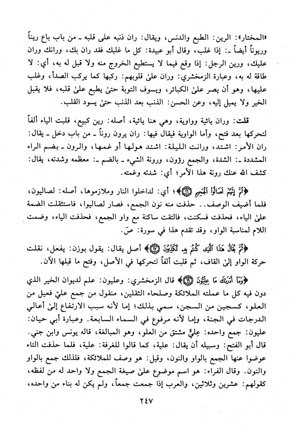 {وَمَا أَدْرَاكَ مَا عِلِّيُّونَ (19)} قال الزمخشري: وعليون: علم لديوان الخير الذي دون فيه كل ما عملته الملائكة وصلحاء الثقلين، منقول من جمع عليّ فعيل من العلو، كسجين من السجن، سمي بذلك؛ إما لأنه سبب الارتفاع إلى أعالي الدرجات في الجنة، وإما لأنه مرفوع في السماء السابعة. وعبارة أبي حيان: عليون: جمع واحده: عِلىٌّ مشتق من العلو، وهو المبالغة، قاله يونس وابن جني. قال أبو الفتح: وسبيله أن يقال: علية، كما قالوا للغرفة: علية، فلما حذفت التاء عوضوا عنها الجمع بالواو والنون، وقيل: هو وصف للملائكة، فلذلك جمع بالواو والنون. وقال الفراء: هو اسم موضوع على صيغة الجمع ولا واحد له من لفظه، كقولهم: عشرين وثلاثين، والعرب إذا جمعت جمعًا، ولم يكن له بناء من واحده،