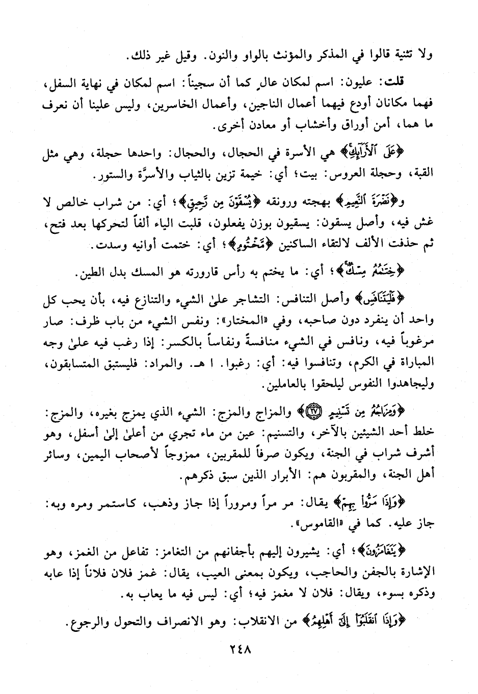 {وَمِزَاجُهُ مِنْ تَسْنِيمٍ (27)} والمزاج والمزج: الشيء الذي يمزج بغيره، والمزج: خلط أحد الشيئين بالآخر، والتسنيم: عين من ماء تجري من أعلى إلى أسفل، وهو أشرف شراب في الجنة، ويكون صرفًا للمقربين، ممزوجًا لأصحاب اليمين، وسائر أهل الجنة، والمقربون هم: الأبرار الذين سبق ذكرهم.