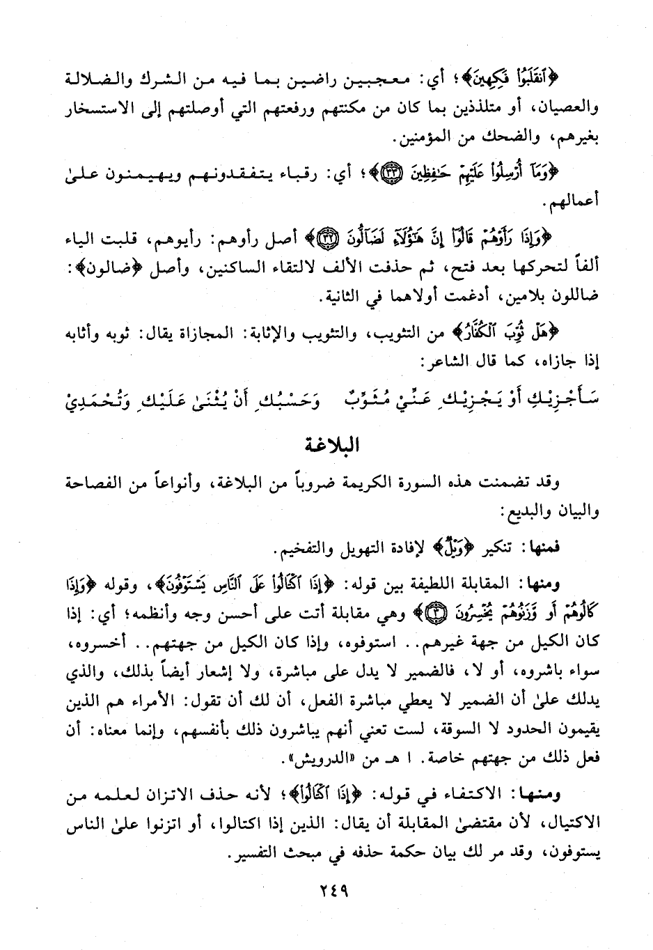 ومنها: المقابلة اللطيفة بين قوله: {إِذَا اكْتَالُوا عَلَى النَّاسِ يَسْتَوْفُونَ} وقوله {إِذَا كَالُوهُمْ أَوْ وَزَنُوهُمْ يُخْسِرُونَ (3)} وهي مقابلة أتت على أحسن وجه وأنظمه؛ أي: إذا كان الكيل من جهة غيرهم .. استوفوه، وإذا كان الكيل من جهتهم .. أخسروه، سواء باشروه، أو لا، فالضمير لا يدل على مباشرة، ولا إشعار أيضًا بذلك، والذي يدلك على أن الضمير لا يعطي مباشرة الفعل، أن لك أن تقول: الأمراء هم الذين يقيمون الحدود لا السوقة، لست تعني أنهم يباشرون ذلك بأنفسهم، وإنما معناه: أن فعل ذلك من جهتهم خاصة. اهـ من "الدرويش".