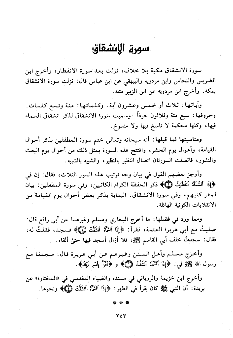 وآياتها: ثلاث أو خمس وعشرون آية. وكلماتها: مئة وتسع كلمات. وحروفها: سبع مئه وثلاثون حرفًا. وسميت سورة الانشقاق لذكر انشقاق السماء فيها، وكلها محكمة لا ناسخ فيها ولا منسوخ.