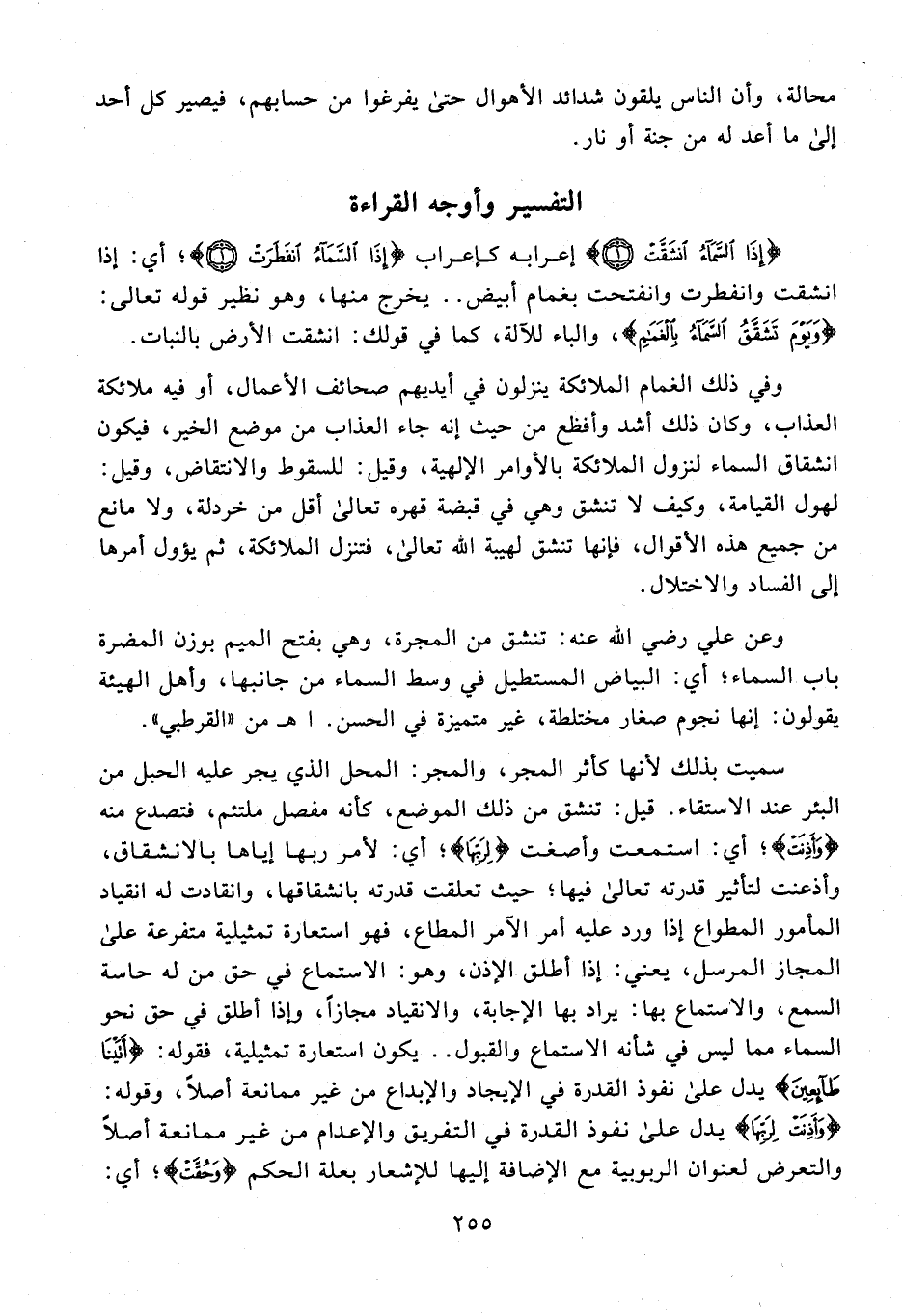 1 - {إِذَا السَّمَاءُ انْشَقَّتْ (1)} إعرابه كإعراب {إِذَا السَّمَاءُ انْفَطَرَتْ (1)}؛ أي: إذا انشقت وانفطرت وانفتحت بغمام أبيض .. يخرج منها، وهو نظير قوله تعالى: {وَيَوْمَ تَشَقَّقُ السَّمَاءُ بِالْغَمَامِ}، والباء للآلة، كما في قولك: انشقت الأرض بالنبات.