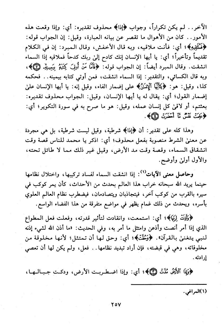 وحاصل معنى الآيات (¬1): إذا انشقت السماء لفساد تركيبها، واختلال نظامها حينما يريد الله سبحانه خراب هذا العالم بحدث من الأحداث، كأن يمر كوكب في سيره بالقرب من كوكب آخر، فيتجاذبان ويتصادمان، فيضطرب نظام العالم العلوي بأسره، ويحدث من ذلك غمام يظهر في مواضع متفرقة من هذا الفضاء الواسع.