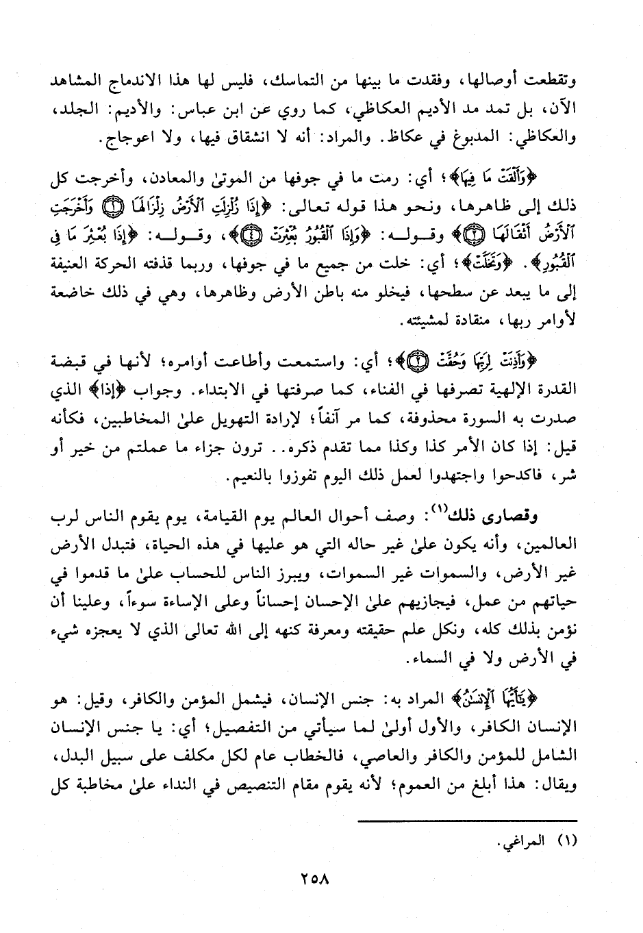وقصارى ذلك (¬1): وصف أحوال العالم يوم القيامة، يوم يقوم الناس لرب العالمين، وأنه يكون على غير حاله التي هو عليها في هذه الحياة، فتبدل الأرض غير الأرض، والسموات غير السموات، ويبرز الناس للحساب على ما قدموا في حياتهم من عمل، فيجازيهم على الإحسان إحسانًا وعلى الإساءة سوءًا، وعلينا أن نؤمن بذلك كله، ونكل علم حقيقته ومعرفة كنهه إلى الله تعالى الذي لا يعجزه شي في الأرض ولا في السماء.
