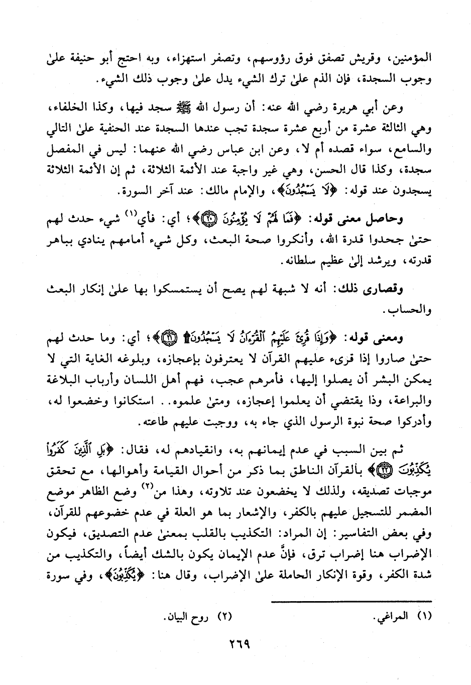 المؤمنين، وقريش تصفق فوق رؤوسهم، وتصفر استهزاء، وبه احتج أبو حنيفة على وجوب السجدة، فإن الذم على ترك الشيء يدل على وجوب ذلك الشيء.