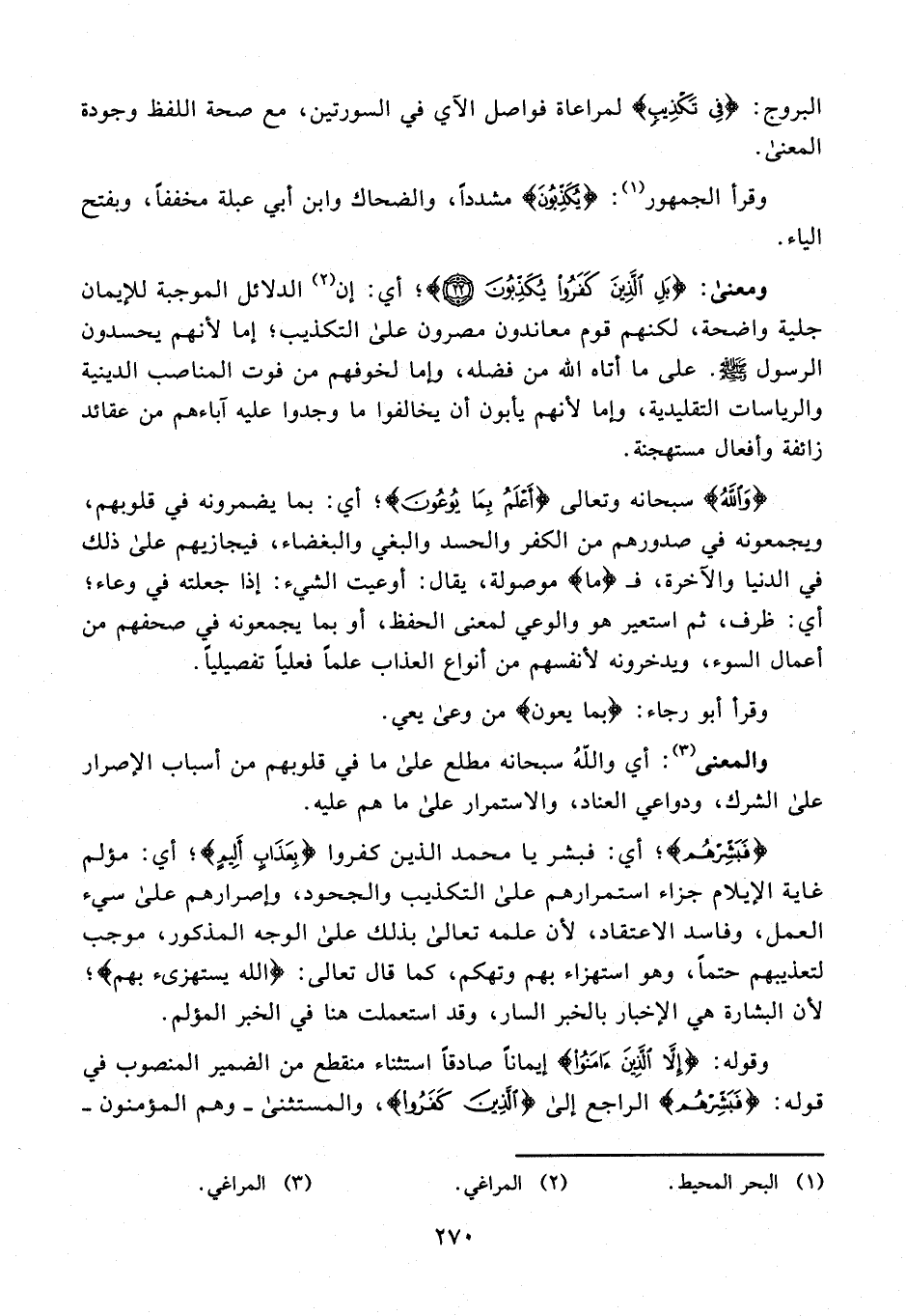 ومعنى: {بَلِ الَّذِينَ كَفَرُوا فِي تَكْذِيبٍ (22)}؛ أي: إن (¬2) الدلائل الموجبة للإيمان جلية واضحة، لكنهم قوم معاندون مصرون على التكذيب؛ إما لأنهم يحسدون الرسول - صلى الله عليه وسلم -. على ما أتاه الله من فضله، وإما لخوفهم من فوت المناصب الدينية والرياسات التقليدية، وإما لأنهم يأبون أن يخالفوا ما وجدوا عليه آباءهم من عقائد زائفة وأفعال مستهجنة.