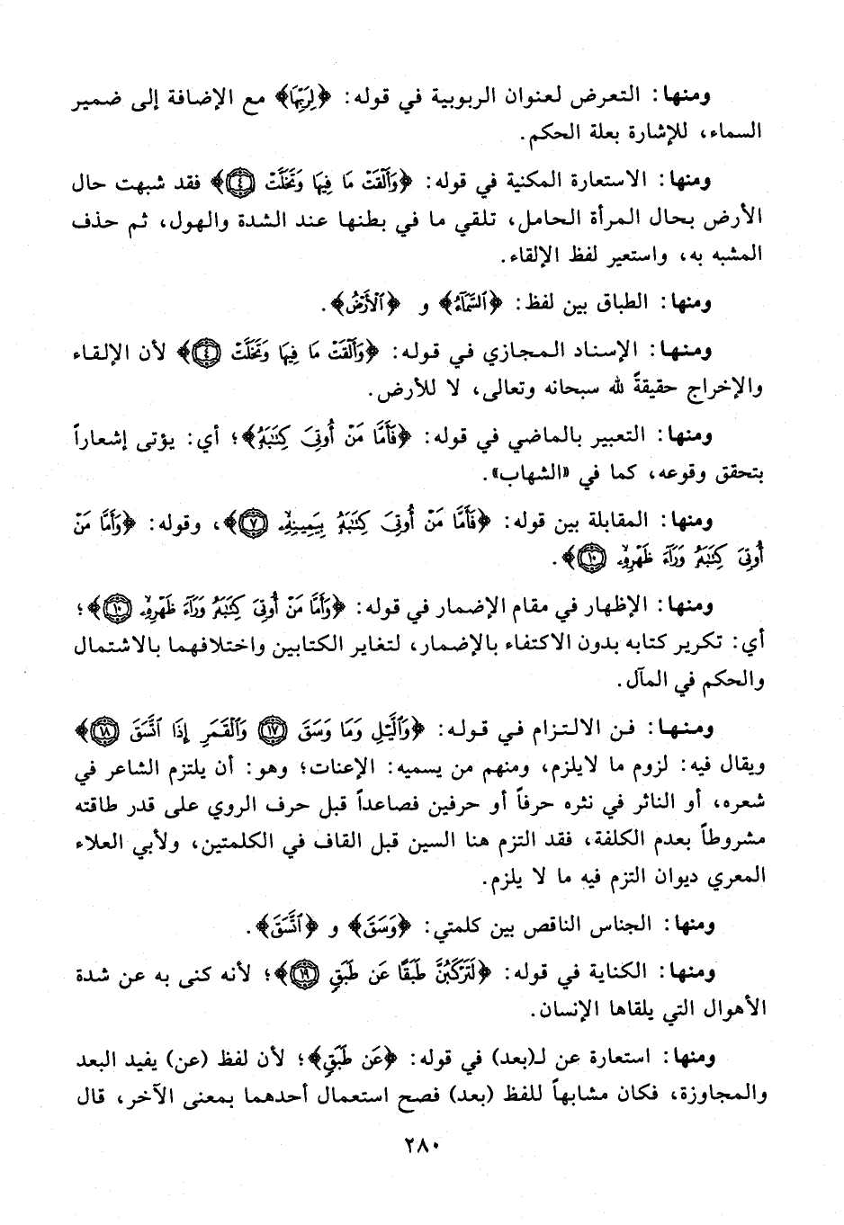 ومنها: فن الالتزام في قوله: {وَاللَّيْلِ وَمَا وَسَقَ (17) وَالْقَمَرِ إِذَا اتَّسَقَ (18)} ويقال فيه: لزوم ما لايلزم، ومنهم من يسميه: الإعنات؛ وهو: أن يلتزم الشاعر في شعره، أو الناثر في نثره حرفًا أو حرفين فصاعدًا قبل حرف الروي على قدر طاقته مشروطًا بعدم الكلفة، فقد التزم هنا السين قبل القاف في الكلمتين، ولأبي العلاء المعري ديوان التزم فيه ما لا يلزم.