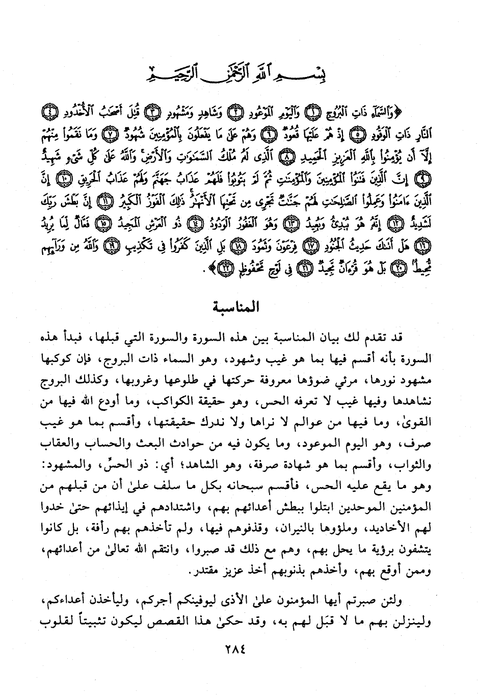 {وَالسَّمَاءِ ذَاتِ الْبُرُوجِ (1) وَالْيَوْمِ الْمَوْعُودِ (2) وَشَاهِدٍ وَمَشْهُودٍ (3) قُتِلَ أَصْحَابُ الْأُخْدُودِ (4) النَّارِ ذَاتِ الْوَقُودِ (5) إِذْ هُمْ عَلَيْهَا قُعُودٌ (6) وَهُمْ عَلَى مَا يَفْعَلُونَ بِالْمُؤْمِنِينَ شُهُودٌ (7) وَمَا نَقَمُوا مِنْهُمْ إِلَّا أَنْ يُؤْمِنُوا بِاللَّهِ الْعَزِيزِ الْحَمِيدِ (8) الَّذِي لَهُ مُلْكُ السَّمَاوَاتِ وَالْأَرْضِ وَاللَّهُ عَلَى كُلِّ شَيْءٍ شَهِيدٌ (9) إِنَّ الَّذِينَ فَتَنُوا الْمُؤْمِنِينَ وَالْمُؤْمِنَاتِ ثُمَّ لَمْ يَتُوبُوا فَلَهُمْ عَذَابُ جَهَنَّمَ وَلَهُمْ عَذَابُ الْحَرِيقِ (10) إِنَّ الَّذِينَ آمَنُوا وَعَمِلُوا الصَّالِحَاتِ لَهُمْ جَنَّاتٌ تَجْرِي مِنْ تَحْتِهَا الْأَنْهَارُ ذَلِكَ الْفَوْزُ الْكَبِيرُ (11) إِنَّ بَطْشَ رَبِّكَ لَشَدِيدٌ (12) إِنَّهُ هُوَ يُبْدِئُ وَيُعِيدُ (13) وَهُوَ الْغَفُورُ الْوَدُودُ (14) ذُو الْعَرْشِ الْمَجِيدُ (15) فَعَّالٌ لِمَا يُرِيدُ (16) هَلْ أَتَاكَ حَدِيثُ الْجُنُودِ (17) فِرْعَوْنَ وَثَمُودَ (18) بَلِ الَّذِينَ كَفَرُوا فِي تَكْذِيبٍ (19) وَاللَّهُ مِنْ وَرَائِهِمْ مُحِيطٌ (20) بَلْ هُوَ قُرْآنٌ مَجِيدٌ (21) فِي لَوْحٍ مَحْفُوظٍ (22)}.