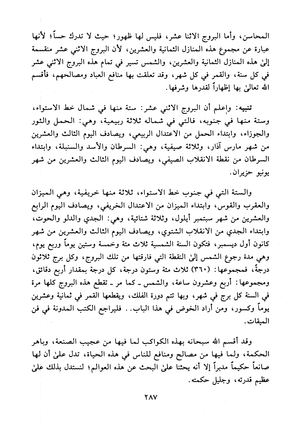 والستة التي في جنوب خط الاستواء، ثلاثة منها خريفية، وهي الميزان والعقرب والقوس، وابتداء الميزان من الاعتدال الخريفي، ويصادف اليوم الرابع والعشرين من شهر سبتمبر أيلول، وثلاثة شتائية، وهي: الجدي والدلو والحوت، وابتداء الجدي من الانقلاب الشتوي، ويصادف اليوم الثالث والعشرين من شهر كانون أول ديسمبر، فتكون السنة الشمسية ثلاث مئة وخمسة وستين يومًا وربع يوم، وهي مدة رجوع الشمس إلى النقطة التي فارقتها من تلك البروج، وكل برج ثلاثون درجةً، فمجموعها: (360) ثلاث مئة وستون درجة، كل درجة بمقدار أربع دقائق، ومجموعها: أربع وعشرون ساعة، والشمس - كما مر - تقطع هذه البروج كلها مرة في السنة كل برج في شهر، وبها تتم دورة الفلك، ويقطعها القمر في ثمانية وعشرين يومًا وكسور، ومن أراد الخوض في هذا الباب .. فليراجع الكتب المدونة في فن الميقات.