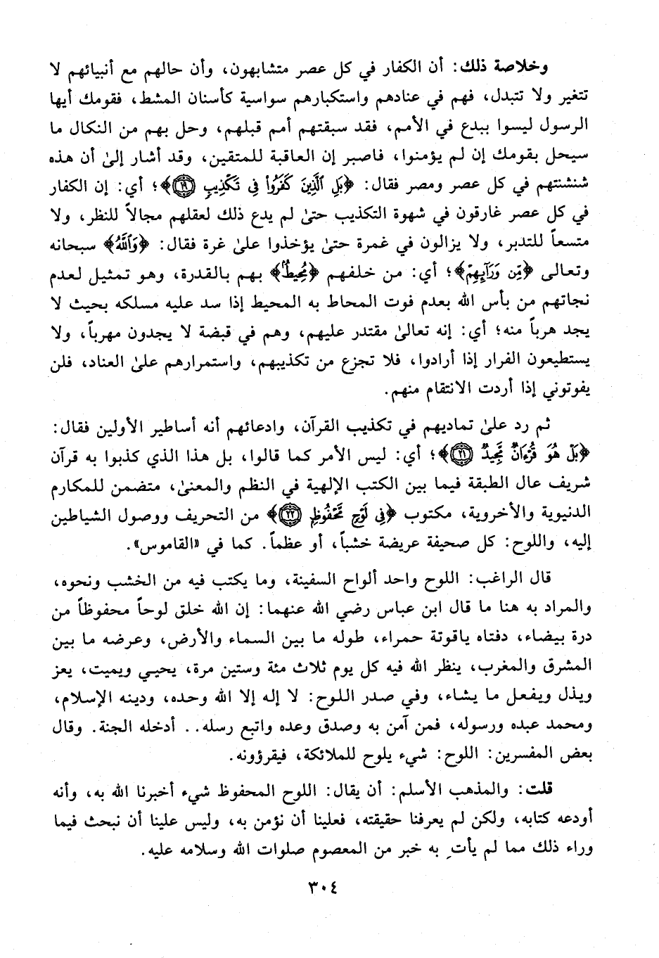 قلت: والمذهب الأسلم: أن يقال: اللوح المحفوظ شيء أخبرنا الله به، وأنه أودعه كتابه، ولكن لم يعرفنا حقيقته، فعلينا أن نؤمن به، وليس علينا أن نبحث فيما وراء ذلك مما لم يأتِ به خبر من المعصوم صلوات الله وسلامه عليه.