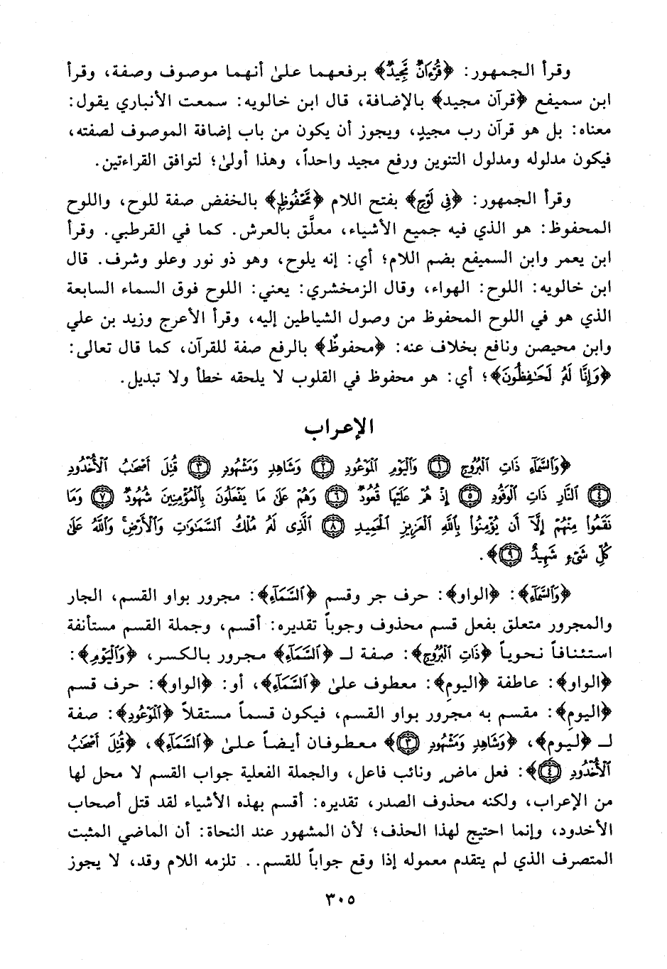 {وَالسَّمَاءِ}: {الواو}: حرف جر وقسم {السَّمَاءِ}: مجرور بواو القسم، الجار والمجرور متعلق بفعل قسم محذوف وجوبًا تقديره: أقسم، وجملة القسم مستأنفة استئنافًا نحويًا {ذَاتِ الْبُرُوجِ}: صفة لـ {السَّمَاءِ} مجرور بالكسر، {وَالْيَوْمِ}: {الواو}: عاطفة {اليومِ}: معطوف على {السَّمَاءِ}، أو: {الواو}: حرف قسم {اليومِ}: مقسم به مجرور بواو القسم، فيكون قسمًا مستقلًا {الْمَوْعُودِ}: صفة لـ {ليوم}، {وَشَاهِدٍ وَمَشْهُودٍ (3)} معطوفان أيضًا على {السَّمَاءِ}، {قُتِلَ أَصْحَابُ الْأُخْدُودِ (4)}: فعل ماضٍ ونائب فاعل، والجملة الفعلية جواب القسم لا محل لها من الإعراب، ولكنه محذوف الصدر، تقديره: أقسم بهذه الأشياء لقد قتل أصحاب الأخدود، وإنما احتيج لهذا الحذف؛ لأن المشهور عند النحاة: أن الماضي المثبت المتصرف الذي لم يتقدم معموله إذا وقع جوابًا للقسم .. تلزمه اللام وقد، لا يجوز