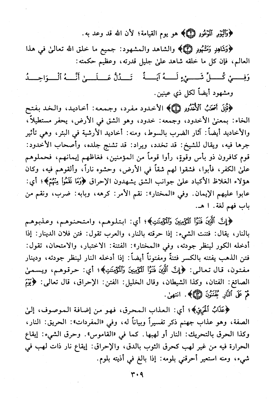 {قُتِلَ أَصْحَابُ الْأُخْدُودِ (4)} الأخدود مفرد، وجمعه: أخاديد، والخد بفتح الخاء: بمعنى الأخدود، وجمعه: خدود، وهو الشق في الأرض، يحفر مستطيلًا، والأخاديد أيضًا: آثار الضرب بالسوط، ومنه: أخاديد الأرشية في البئر، وهي تأثير جرها فيه، ويقال للشيخ: قد تخدد، ويراد: قد تشنج جلده، وأصحاب الأخدود: قوم كافرون ذو بأس وقوةٍ، رأوا قومًا من المؤمنين، فغاظهم إيمانهم، فحملوهم على الكفر، فأبوا، فشقوا لهم شقًا في الأرض، وحشوه نارًا، وألقوهم فيه، وكان هؤلاء الغلاظ الأكباد على جوانب الشق يشهدون الإحراق {وَمَا نَقَمُوا مِنْهُمْ}؛ أي: عابوا عليهم الإيمان. وفي "المختار": نقم الأمر: كرهه، وبابه: ضرب، ونقم من باب فهم لغة. اهـ.