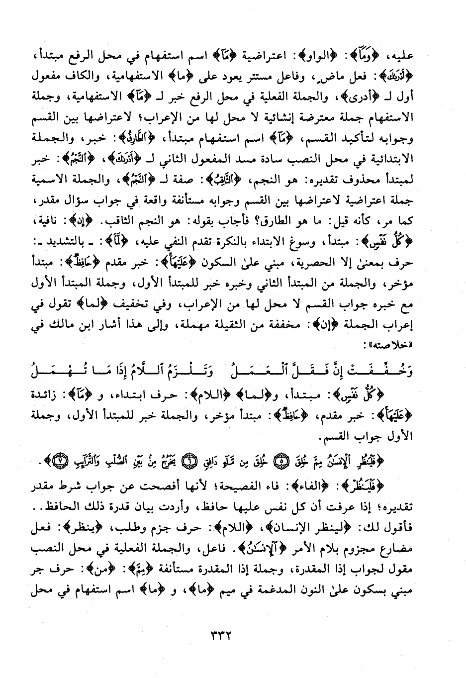 عليه، {وَمَا}: {الواو}: اعتراضية {مَا}: اسم استفهام في محل الرفع مبتدأ، {أَدْرَاكَ}: فعل ماضٍ، وفاعل مستتر يعود على {ما} الاستفهامية، والكاف مفعول أول لـ {أدرى}، والجملة الفعلية في محل الرفع خبر لـ {مَا} الاستفهامية، وجملة الاستفهام جملة معترضة إنشائية لا محل لها من الإعراب؛ لاعتراضها بين القسم وجوابه لتأكيد القسم، {مَا} اسم استفهام مبتدأ، {الطَّارِقُ}: خبر، والجملة الابتدائية في محل النصب سادة مسد المفعول الثاني لـ {أَدْرَاكَ}، {النَّجْمُ}: خبر لمبتدأ محذوف تقديره: هو النجم، {الثَّاقِبُ}: صفة لـ {النَّجْمُ}، والجملة الاسمية جملة اعتراضية لاعتراضها بين القسم وجوابه مستأنفة واقعة في جواب سؤال مقدر، كما مر، كأنه قيل: ما هو الطارق؟ فأجاب بقوله: هو النجم الثاقب. {إِنْ}: نافية، {كُلُّ نَفْسٍ}: مبتدأ، وسوغ الابتداء بالنكرة تقدم النفي عليه، {لَمَّا}: - بالتشديد -: حرف بمعنى إلا الحصرية، مبني على السكون {عَلَيْهَا}: خبر مقدم {حَافِظٌ}: مبتدأ مؤخر، والجملة من المبتدأ الثاني وخبره خبر للمبتدأ الأول، وجملة المبتدأ الأول مع خبره جواب القسم لا محل لها من الإعراب، وفي تخفيف {لما} تقول في إعراب الجملة {إن}: مخففة من الثقيلة مهملة، وإلى هذا أشار ابن مالك في "خلاصته":