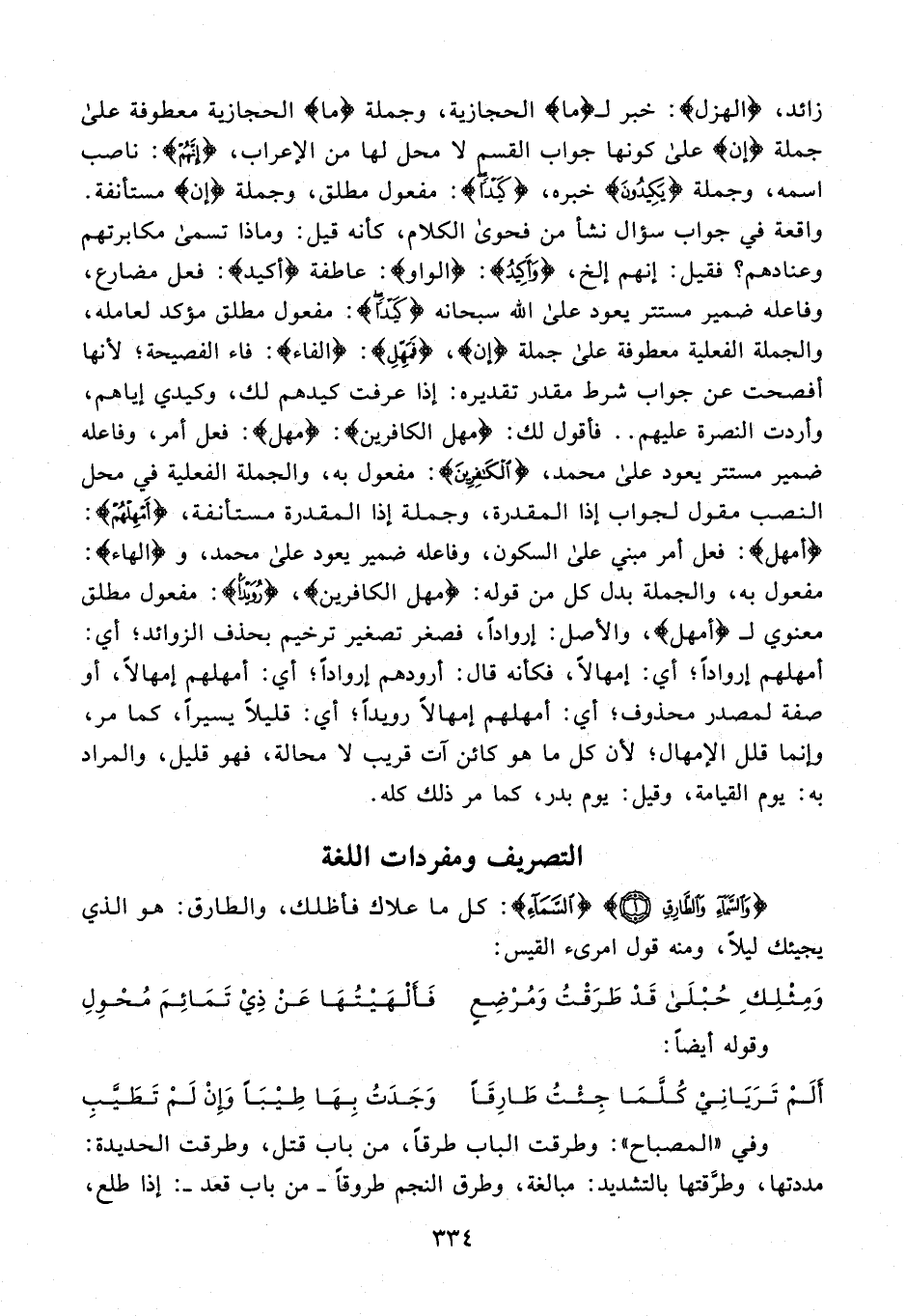 زائد، {الهزل}: خبر لـ {ما} الحجازية، وجملة {ما} الحجازية معطوفة على جملة {إن} على كونها جواب القسم لا محل لها من الإعراب، {إِنَّهُمْ}: ناصب اسمه، وجملة {يَكِيدُونَ} خبره، {كَيْدًا}: مفعول مطلق، وجملة {إن} مستأنفة. واقعة في جواب سؤال نشأ من فحوى الكلام، كأنه قيل: وماذا تسمى مكابرتهم وعنادهم؟ فقيل: إنهم إلخ، {وَأَكِيدُ}: {الواو}: عاطفة {أكيد}: فعل مضارع، وفاعله ضمير مستتر يعود على الله سبحانه {كَيْدًا}: مفعول مطلق مؤكد لعامله، والجملة الفعلية معطوفة على جملة {إن}، {فَمَهِّلِ}: {الفاء}: فاء الفصيحة؛ لأنها أفصحت عن جواب شرط مقدر تقديره: إذا عرفت كيدهم لك، وكيدي إياهم، وأردت النصرة عليهم .. فأقول لك: {مهل الكافرين}: {مهل}: فعل أمر، وفاعله ضمير مستتر يعود على محمد، {الْكَافِرِينَ}: مفعول به، والجملة الفعلية في محل النصب مقول لجواب إذا المقدرة، وجملة إذا المقدرة مستأنفة، {أَمْهِلْهُمْ}: {أمهل}: فعل أمر مبني على السكون، وفاعله ضمير يعود على محمد، و {الهاء}: مفعول به، والجملة بدل كل من قوله: {مهل الكافرين}، {رُوَيْدًا}: مفعول مطلق معنوي لـ {أمهل}، والأصل: إروادًا، فصغر تصغير ترخيم بحذف الزوائد؛ أي: أمهلهم إروادًا؛ أي: إمهالًا، فكأنه قال: أرودهم إروادًا؛ أي: أمهلهم إمهالًا، أو صفة لمصدر محذوف؛ أي: أمهلهم إمهالًا رويدًا؛ أي: قليلًا يسيرًا، كما مر، وإنما قلل الإمهال؛ لأن كل ما هو كائن آت قريب لا محالة، فهو قليل، والمراد به: يوم القيامة، وقيل: يوم بدر، كما مر ذلك كله.