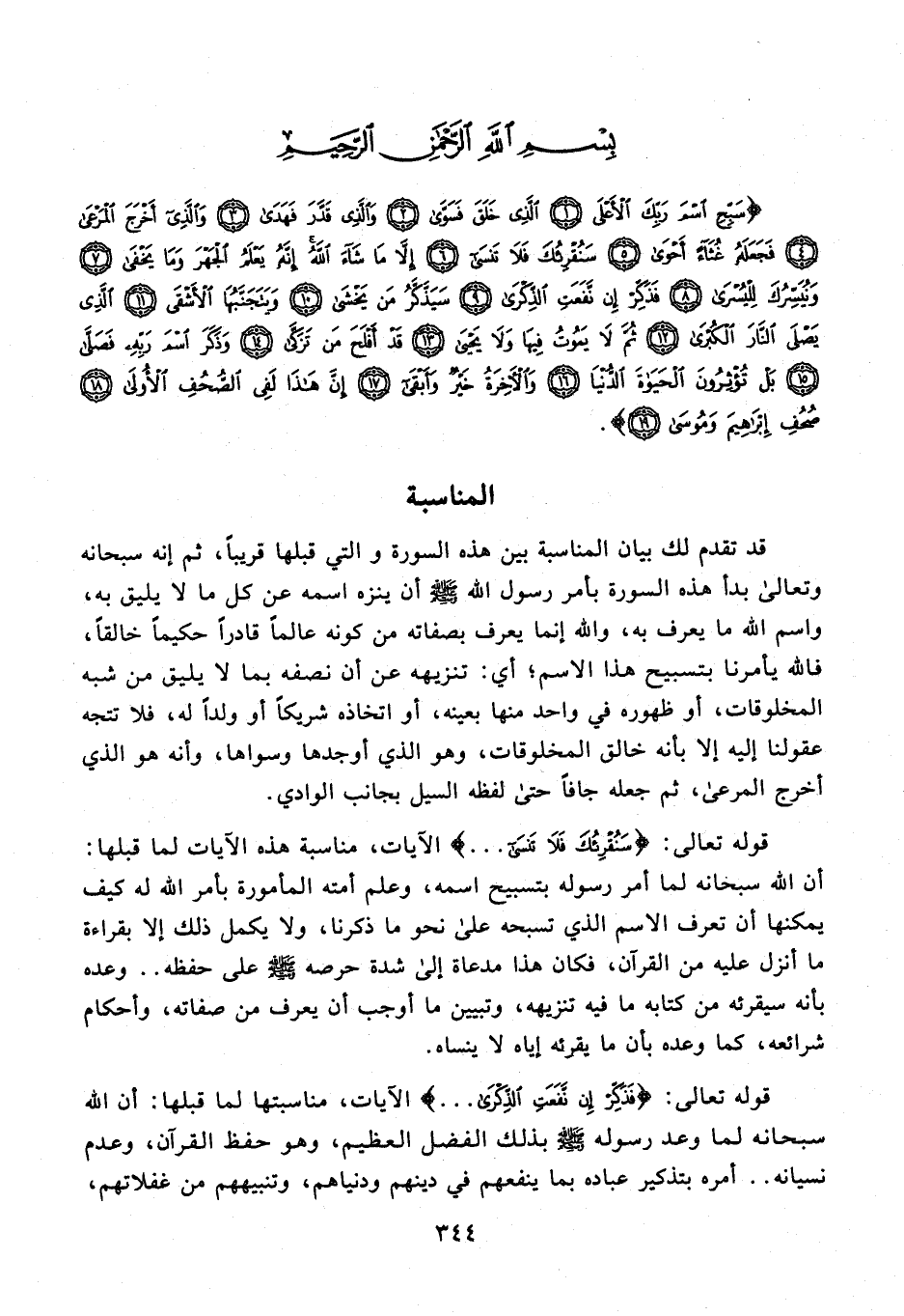 {سَبِّحِ اسْمَ رَبِّكَ الْأَعْلَى (1) الَّذِي خَلَقَ فَسَوَّى (2) وَالَّذِي قَدَّرَ فَهَدَى (3) وَالَّذِي أَخْرَجَ الْمَرْعَى (4) فَجَعَلَهُ غُثَاءً أَحْوَى (5) سَنُقْرِئُكَ فَلَا تَنْسَى (6) إِلَّا مَا شَاءَ اللَّهُ إِنَّهُ يَعْلَمُ الْجَهْرَ وَمَا يَخْفَى (7) وَنُيَسِّرُكَ لِلْيُسْرَى (8) فَذَكِّرْ إِنْ نَفَعَتِ الذِّكْرَى (9) سَيَذَّكَّرُ مَنْ يَخْشَى (10) وَيَتَجَنَّبُهَا الْأَشْقَى (11) الَّذِي يَصْلَى النَّارَ الْكُبْرَى (12) ثُمَّ لَا يَمُوتُ فِيهَا وَلَا يَحْيَى (13) قَدْ أَفْلَحَ مَنْ تَزَكَّى (14) وَذَكَرَ اسْمَ رَبِّهِ فَصَلَّى (15) بَلْ تُؤْثِرُونَ الْحَيَاةَ الدُّنْيَا (16) وَالْآخِرَةُ خَيْرٌ وَأَبْقَى (17) إِنَّ هَذَا لَفِي الصُّحُفِ الْأُولَى (18) صُحُفِ إِبْرَاهِيمَ وَمُوسَى (19)}.