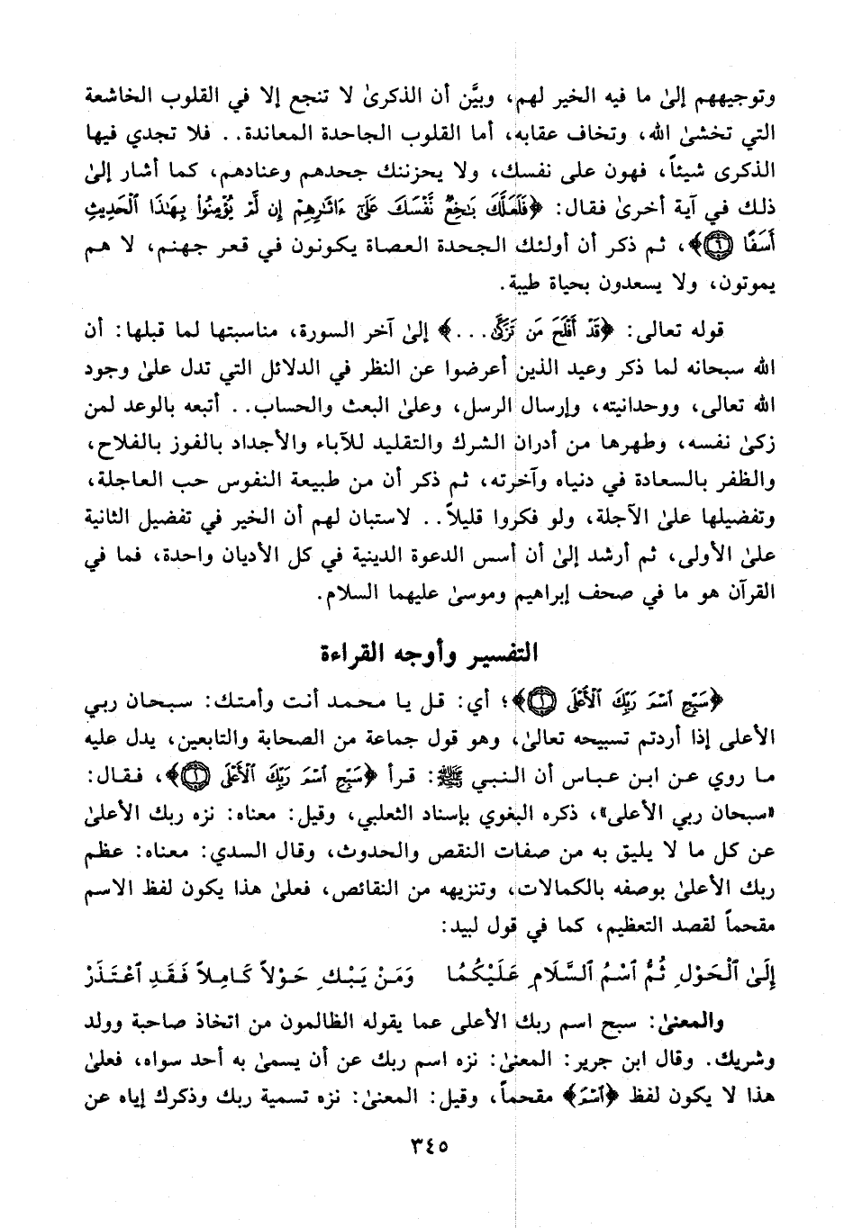 1 - {سَبِّحِ اسْمَ رَبِّكَ الْأَعْلَى (1)}؛ أي: قل يا محمد أنت وأمتك: سبحان ربي الأعلى إذا أردتم تسبيحه تعالى، وهو قول جماعة من الصحابة والتابعين، يدل عليه ما روي عن ابن عباس أن النبي - صلى الله عليه وسلم -: قرأ {سَبِّحِ اسْمَ رَبِّكَ الْأَعْلَى (1)}، فقال: "سبحان ربي الأعلى"، ذكره البغوي بإسناد الثعلبي، وقيل: معناه: نزه ربك الأعلى عن كل ما لا يليق به من صفات النقص والحدوث، وقال السدي: معناه: عظم ربك الأعلى بوصفه بالكمالات، وتنزيهه من النقائص، فعلى هذا يكون لفظ الاسم مقحمًا لقصد التعظيم، كما في قول لبيد: