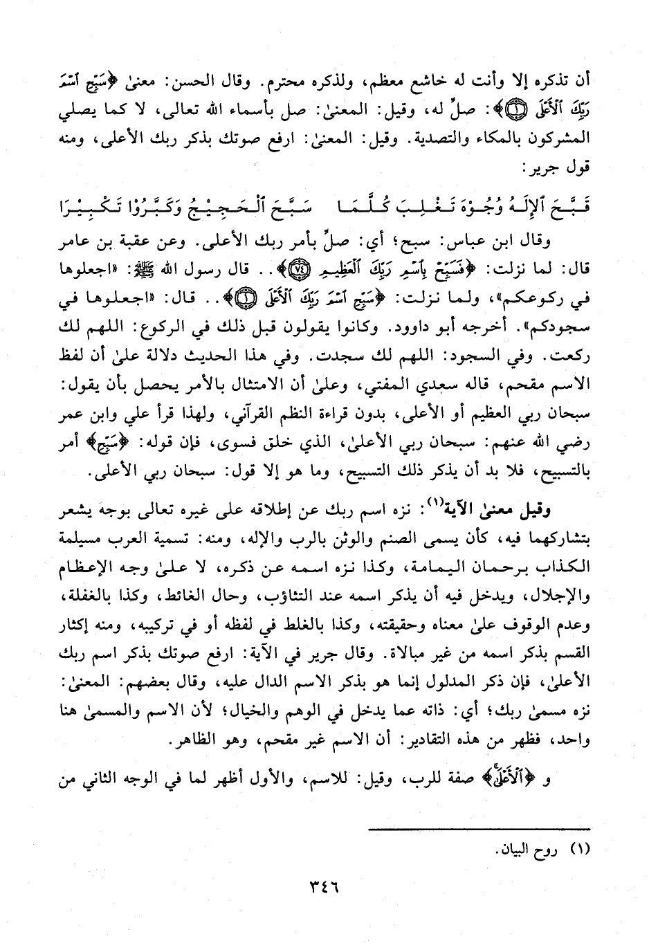 أن تذكره إلا وأنت له خاشع معظم، ولذكره محترم. وقال الحسن: معنى {سَبِّحِ اسْمَ رَبِّكَ الْأَعْلَى (1)}: صلِّ له، وقيل: المعنى: صل بأسماء الله تعالى، لا كما يصلي المشركون بالمكاء والتصدية. وقيل: المعنى: ارفع صوتك بذكر ربك الأعلى، ومنه قول جرير: