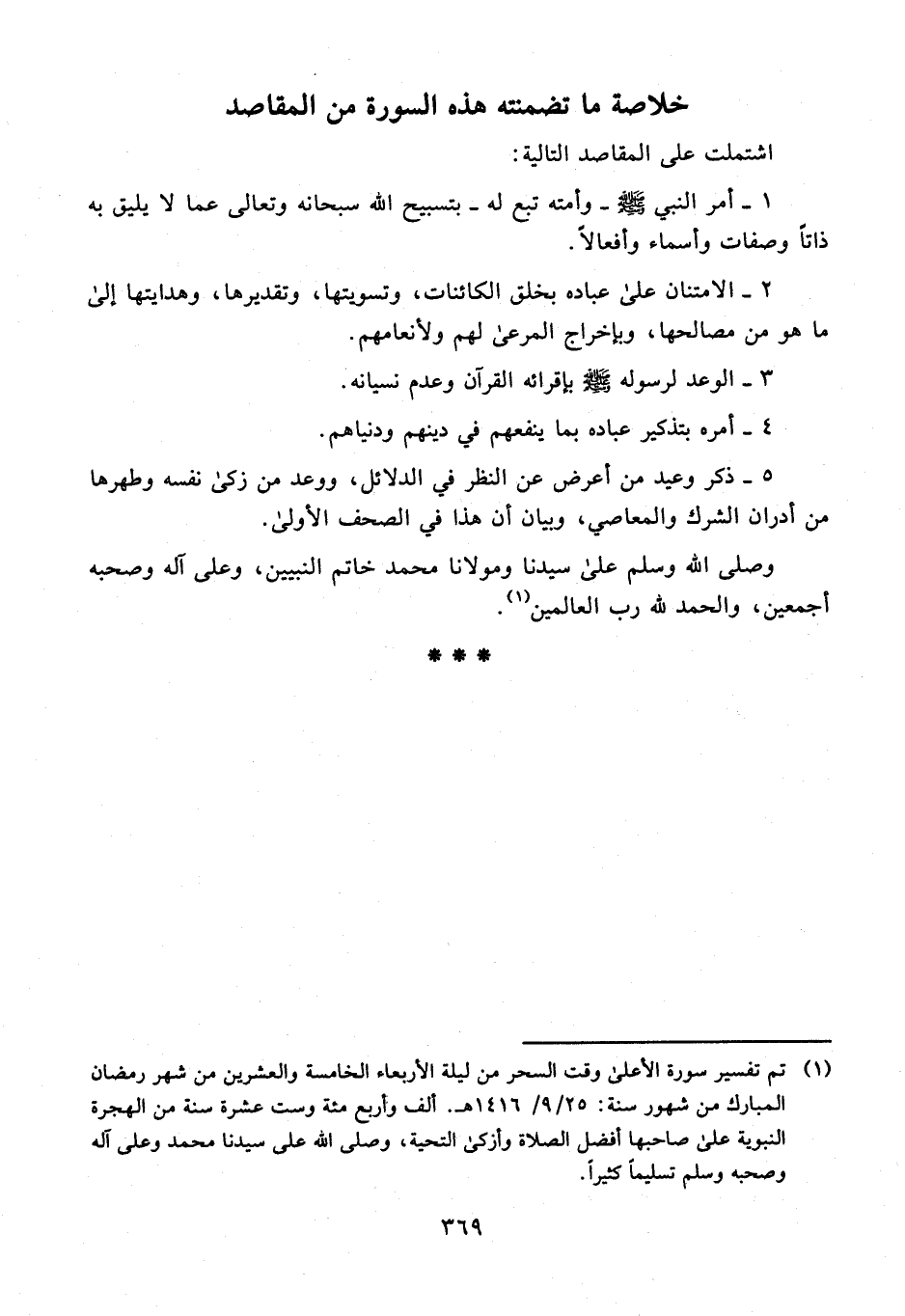 (¬1) تم تفسير سورة الأعلى وقت السحر من ليلة الأربعاء الخامسة والعشرين من شهر رمضان المبارك من شهور سنة: 25/ 9/ 1416 هـ. ألف وأربع مئة وست عشرة سنة من الهجرة النبوية على صاحبها أفضل الصلاة وأزكى التحية، وصلى الله على سيدنا محمد وعلى آله وصحبه وسلم تسليمًا كثيرًا.