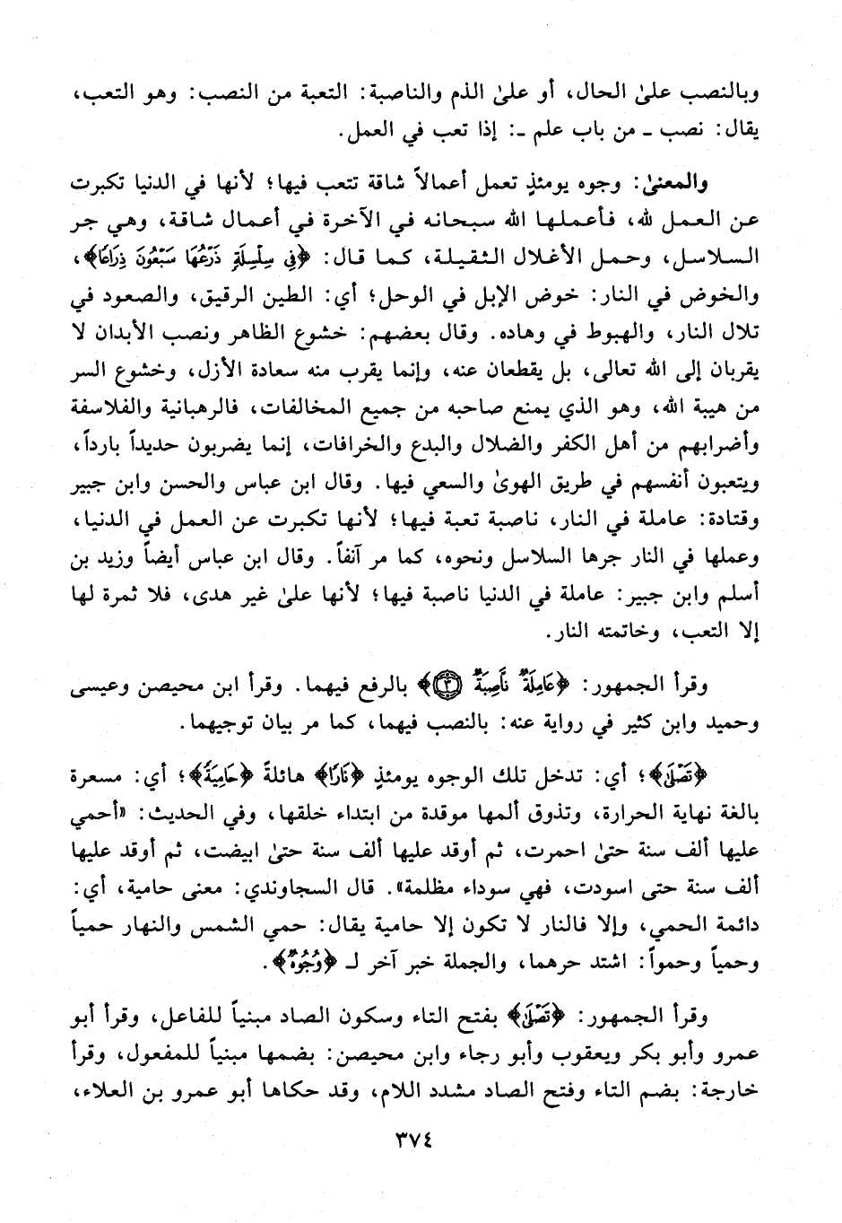 والمعنى: وجوه يومئذٍ تعمل أعمالًا شاقة تتعب فيها؛ لأنها في الدنيا تكبرت عن العمل لله، فأعملها الله سبحانه في الآخرة في أعمال شاقة، وهي جر السلاسل، وحمل الأغلال الثقيلة، كما قال: {فِي سِلْسِلَةٍ ذَرْعُهَا سَبْعُونَ ذِرَاعًا}، والخوض في النار: خوض الإبل في الوحل؛ أي: الطين الرقيق، والصعود في تلال النار، والهبوط في وهاده. وقال بعضهم: خشوع الظاهر ونصب الأبدان لا يقربان إلى الله تعالى، بل يقطعان عنه، وإنما يقرب منه سعادة الأزل، وخشوع السر من هيبة الله، وهو الذي يمنع صاحبه من جميع المخالفات، فالرهبانية والفلاسفة وأضرابهم من أهل الكفر والضلال والبدع والخرافات، إنما يضربون حديدًا باردًا، ويتعبون أنفسهم في طريق الهوى والسعي فيها. وقال ابن عباس والحسن وابن جبير وقتادة: عاملة في النار، ناصبة تعبة فيها؛ لأنها تكبرت عن العمل في الدنيا، وعملها في النار جرها السلاسل ونحوه، كما مر آنفًا. وقال ابن عباس أيضًا وزيد بن أسلم وابن جبير: عاملة في الدنيا ناصبة فيها؛ لأنها على غير هدى، فلا ثمرة لها إلا التعب، وخاتمته النار.