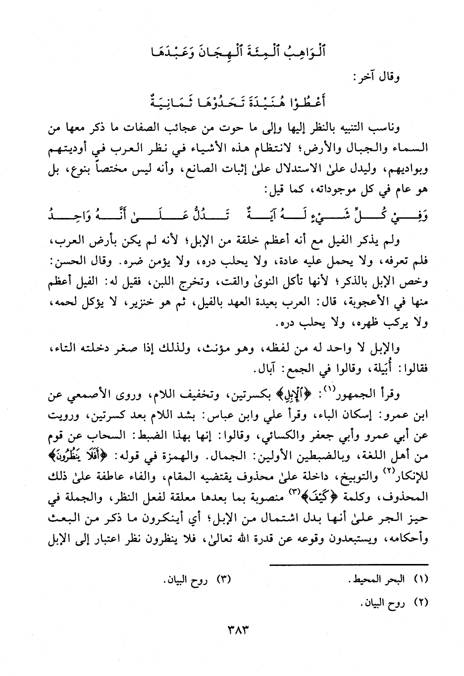 ولم يذكر الفيل مع أنه أعظم خلقة من الإبل؛ لأنه لم يكن بأرض العرب، فلم تعرفه، ولا يحمل عليه عادة، ولا يحلب دره، ولا يؤمن ضره. وقال الحسن: وخص الإبل بالذكر؛ لأنها تأكل النوى والقت، وتخرج اللبن، فقيل له: الفيل أعظم منها في الأعجوبة، قال: العرب بعيدة العهد بالفيل، ثم هو خنزير، لا يؤكل لحمه، ولا يركب ظهره، ولا يحلب دره.