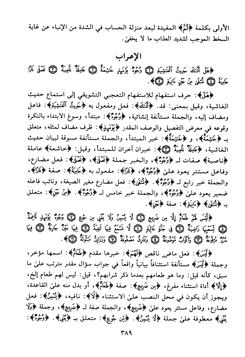 {هَلْ أَتَاكَ حَدِيثُ الْغَاشِيَةِ (1) وُجُوهٌ يَوْمَئِذٍ خَاشِعَةٌ (2) عَامِلَةٌ نَاصِبَةٌ (3) تَصْلَى نَارًا حَامِيَةً (4) تُسْقَى مِنْ عَيْنٍ آنِيَةٍ (5)}.