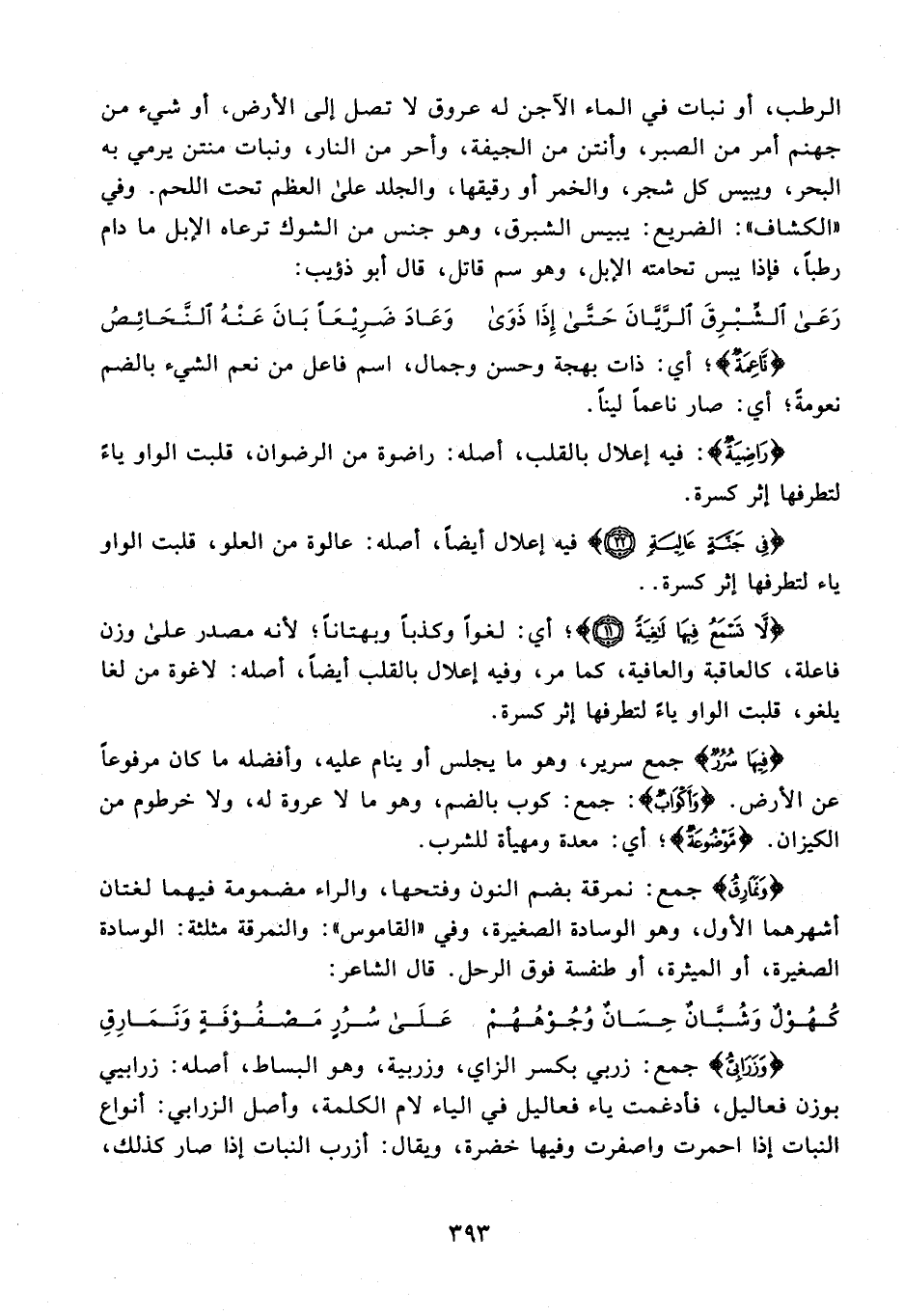 {وَزَرَابِيُّ} جمع: زربي بكسر الزاي، وزربية، وهو البساط، أصله: زرابيي بوزن فعاليل، فأدغمت ياء فعاليل في الياء لام الكلمة، وأصل الزرابي: أنواع النبات إذا احمرت واصفرت وفيها خضرة، ويقال: أزرب النبات إذا صار كذلك،