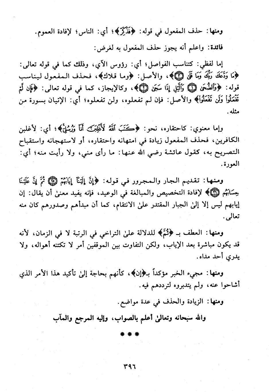 إما لفظي: كتناسب الفواصل؛ أي: رؤوس الآي، وذلك كما في قوله تعالى: {مَا وَدَّعَكَ رَبُّكَ وَمَا قَلَى (3)}، والأصل: {وما قلاك}، فحذف المفعول ليناسب قوله: {وَالضُّحَى (1) وَاللَّيْلِ إِذَا سَجَى (2)}، وكالإيجاز، كما في قوله تعالى: {فَإِنْ لَمْ تَفْعَلُوا وَلَنْ تَفْعَلُوا} والأصل: فإن لم تفعلوه، ولن تفعلوه؛ أي: الإتيان بسورة من مثله.