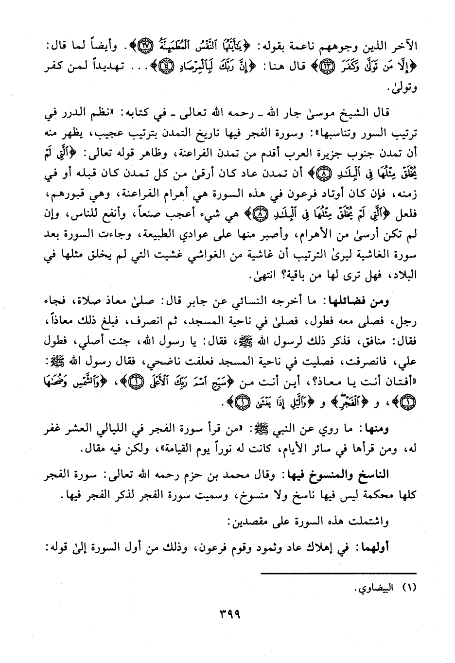 ومنها: ما روي عن النبي - صلى الله عليه وسلم -: "من قرأ سورة الفجر في الليالي العشر غفر له، ومن قرأها في سائر الأيام، كانت له نورًا يوم القيامة"، ولكن فيه مقال.