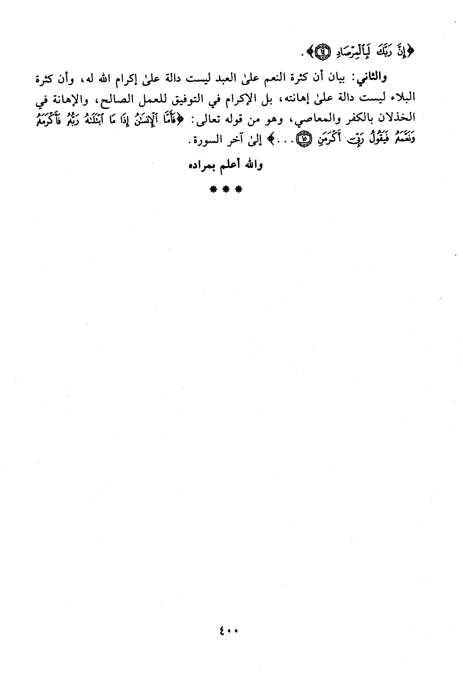 والثاني: بيان أن كثرة النعم على العبد ليست دالة على إكرام الله له، وأن كثرة البلاء ليست دالة على إهانته، بل الإكرام في التوفيق للعمل الصالح، والإهانة في الخذلان بالكفر والمعاصي، وهو من قوله تعالى: {فَأَمَّا الْإِنْسَانُ إِذَا مَا ابْتَلَاهُ رَبُّهُ فَأَكْرَمَهُ وَنَعَّمَهُ فَيَقُولُ رَبِّي أَكْرَمَنِ (15) ...} إلى آخر السورة.
