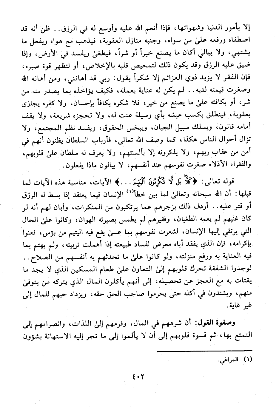 إلا بأمور الدنيا وشهواتها، فإذا أنعم الله عليه وأوسع له في الرزق .. ظن أنه قد اصطفاه ورفعه على من سواه، وجنبه منازل العقوبة، فيذهب مع هواه ويفعل ما يشتهي، ولا يبالي أكان ما يصنع خيرًا أو شرًا، فيطغى ويفسد في الأرض، وإذا ضيق عليه الرزق وقد يكون ذلك لتمحيص قلبه بالإخلاص، أو لتظهر قوة صبره، فإن الفقر لا يزيد ذوي العزائم إلا شكرًا يقول: ربي قد أهانني، ومن أهانه الله وصغرت قيمته لديه .. لم يكن له عناية بعمله، فكيف يؤاخذه بما يصدر منه من شر، أو يكافئه على ما يصنع من خير، فلا شكره يكافأ بإحسان، ولا كفره يجازى بعقوبة، فينطلق بكسب عيشه بأي وسيلة عنت له، ولا تحجزه شريعة، ولا يقف أمامه قانون، ويسلك سبيل الجبان، ويبخس الحقوق، ويفسد نظم المجتمع، ولا تزال أحوال الناس هكذا، كما وصف الله تعالى، فأرباب السلطان يظنون أنهم في أمن من عقاب ربهم، ولا يذكرونه إلا بألسنتهم، ولا يعرف له سلطان على قلوبهم، والفقراء الأذلاء صغرت نفوسهم عند أنفسهم، لا يبالون ماذا يفعلون.
