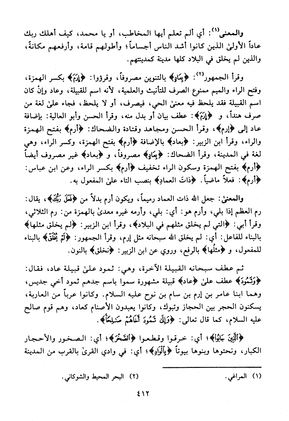 وقرأ الجمهور (¬2): {بِعَادٍ} بالتنوين مصروفًا، وقرؤوا: {إِرَمَ} بكسر الهمزة، وفتح الراء والميم ممنوع الصرف للتأنيث والعلمية، لأنه اسم للقبيلة، وعاد وإنْ كان اسم القبيلة فقد يلحظ فيه معنى الحي، فيصرف، أو لا يلحظ، فجاء على لغة من صرف هندًا، و {إِرَمَ}: عطف بيان أو بدل منه، وقرأ الحسن وأبو العالية: بإضافة عاد إلى {إرم}، وقرأ الحسن ومجاهد وقتادة والضحاك: {أرم} بفتح الهمزة والراء، وقرأ ابن الزبير: {بعاد} بالإضافة {أرم} بفتح الهمزة، وكسر الراء، وهي لغة في المدينة، وقرأ الضحاك: {بِعَادٍ} مصروفًا، و {بعاد} غير مصروف أيضًا {أرم} بفتح الهمزة وسكون الراء تخفيف {أرم} بكسر الراء، وعن ابن عباس: {أرم}: فعلًا ماضيًا. {ذاتَ العمادِ} بنصب التاء على المفعول به.
