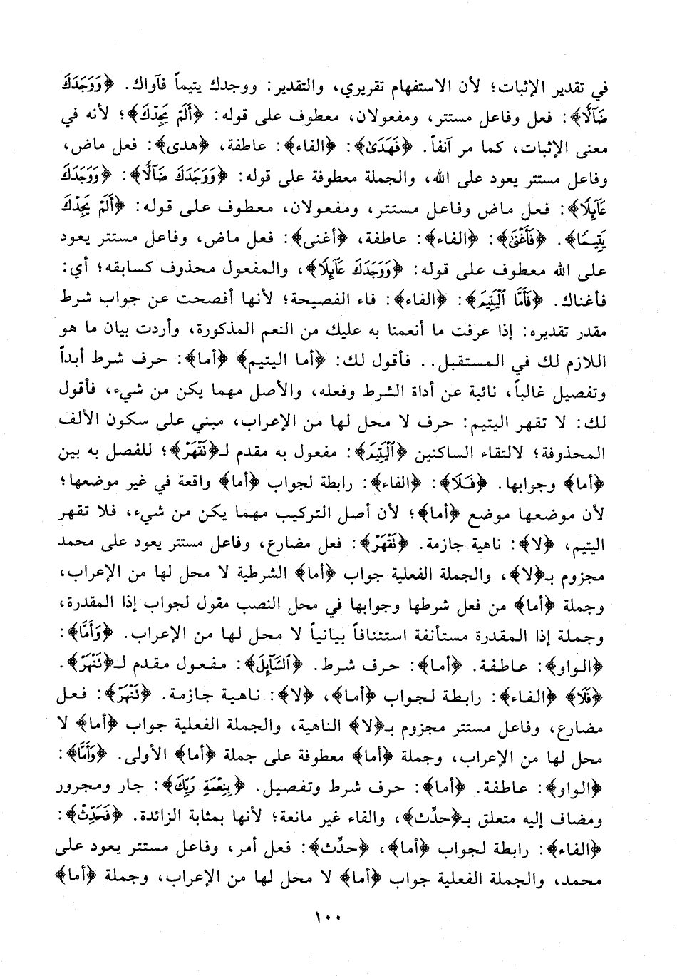 في تقدير الإثبات؛ لأن الاستفهام تقريري، والتقدير: ووجدك يتيمًا فآواك. {وَوَجَدَكَ ضَالًّا}: فعل وفاعل مستتر، ومفعولان، معطوف على قوله: {أَلَمْ يَجِدْكَ}؛ لأنه في معنى الإثبات، كما مر آنفًا. {فَهَدَى}: {الفاء}: عاطفة، {هدى}: فعل ماض، وفاعل مستتر يعود على الله، والجملة معطوفة على قوله: {وَوَجَدَكَ ضَالًّا}: {وَوَجَدَكَ عَائِلًا}: فعل ماض وفاعل مستتر، ومفعولان، معطوف على قوله: {أَلَمْ يَجِدْكَ يَتِيمًا}. {فَأَغْنَى}: {الفاء}: عاطفة، {أغنى}: فعل ماض، وفاعل مستتر يعود على الله معطوف على قوله: {وَوَجَدَكَ عَائِلًا}، والمفعول محذوف كسابقه؛ أي: فأغناك. {فَأَمَّا الْيَتِيمَ}: {الفاء}: فاء الفصيحة؛ لأنها أفصحت عن جواب شرط مقدر تقديره: إذا عرفت ما أنعمنا به عليك من النعم المذكورة، وأردت بيان ما هو اللازم لك في المستقبل .. فأقول لك: {أما اليتيم} {أما}: حرف شرط أبدًا وتفصيل غالبًا، نائبة عن أداة الشرط وفعله، والأصل مهما يكن من شيء، فأقول لك: لا تقهر اليتيم: حرف لا محل لها من الإعراب، مبني على سكون الألف المحذوفة؛ لالتقاء الساكنين {الْيَتِيمَ}: مفعول به مقدم لـ {تَقْهَرْ}؛ للفصل به بين {أما} وجوابها. {فَلَا}: {الفاء}: رابطة لجواب {أما} واقعة في غير موضعها؛ لأن موضعها موضع {أما}؛ لأن أصل التركيب مهما يكن من شيء، فلا تقهر اليتيم، {لا}: ناهية جازمة. {تَقْهَرْ}: فعل مضارع، وفاعل مستتر يعود على محمد مجزوم بـ {لا}، والجملة الفعلية جواب {أما} الشرطية لا محل لها من الإعراب، وجملة {أما} من فعل شرطها وجوابها في محل النصب مقول لجواب إذا المقدرة، وجملة إذا المقدرة مستأنفة استئنافًا بيانيًا لا محل لها من الإعراب. {وَأَمَّا}: {الواو}: عاطفة. {أما}: حرف شرط. {السَّائِلَ}: مفعول مقدم لـ {تَنْهَرْ} {فَلَا} {الفاء}: رابطة لجواب {أما}، {لا}: ناهية جازمة. {تَنْهَرْ}: فعل مضارع، وفاعل مستتر مجزوم بـ {لا} الناهية، والجملة الفعلية جواب {أما} لا محل لها من الإعراب، وجملة {أما} معطوفة على جملة {أما} الأولى. {وَأَمَّا}: {الواو}: عاطفة. {أما}: حرف شرط وتفصيل. {بِنِعْمَةِ رَبِّكَ}: جار ومجرور ومضاف إليه متعلق بـ {حَدِّثْ}، والفاء غير مانعة؛ لأنها بمثابة الزائدة. {فَحَدِّثْ}: {الفاء}: رابطة لجواب {أما}، {حدِّث}: فعل أمر، وفاعل مستتر يعود على محمد، والجملة الفعلية جواب {أما} لا محل لها من الإعراب، وجملة {أما}