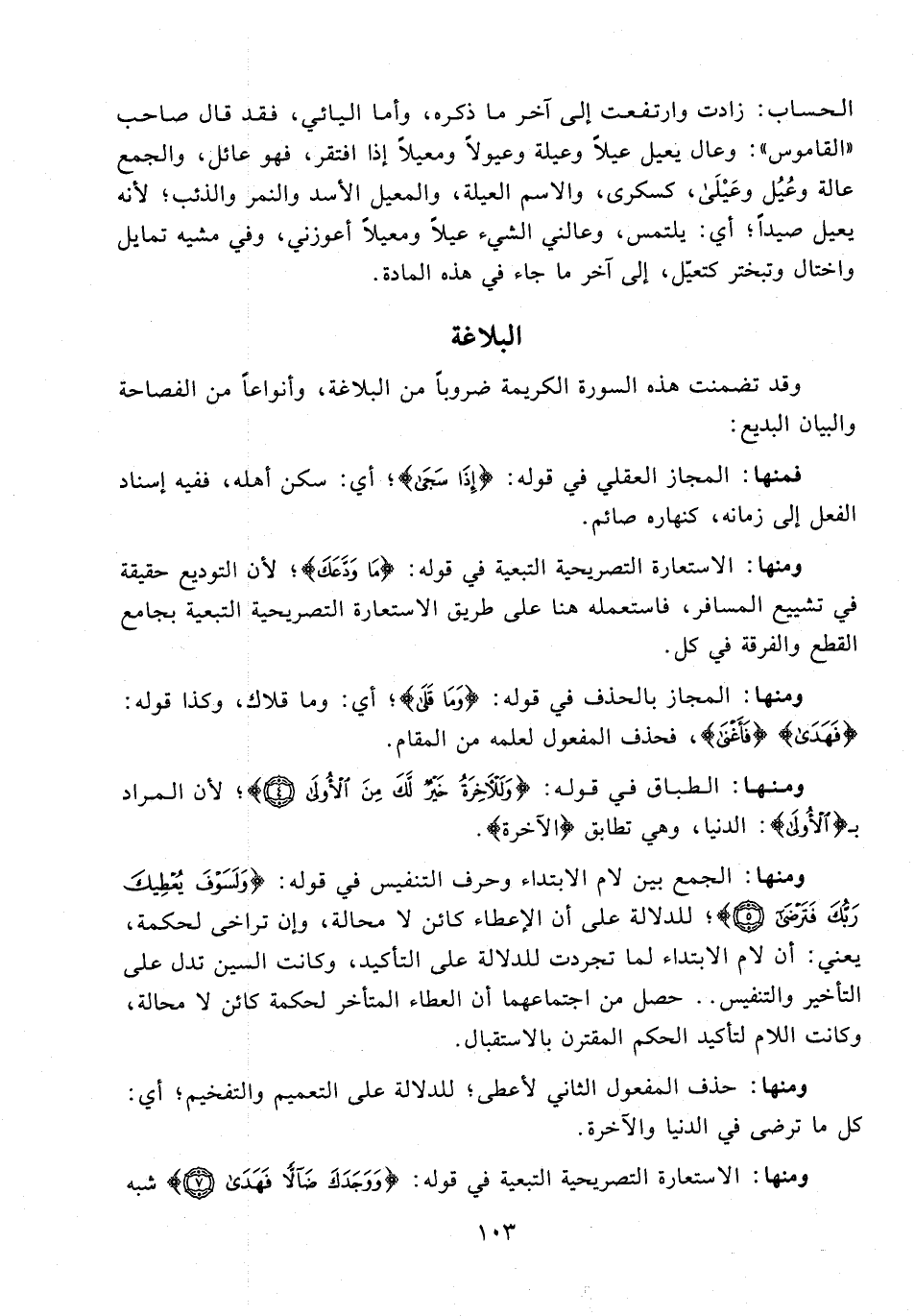 ومنها: المجاز بالحذف في قوله: {وَمَا قَلَى}؛ أي: وما قلاك، وكذا قوله: {فَهَدَى} {فَأَغْنَى}، فحذف المفعول لعلمه من المقام.