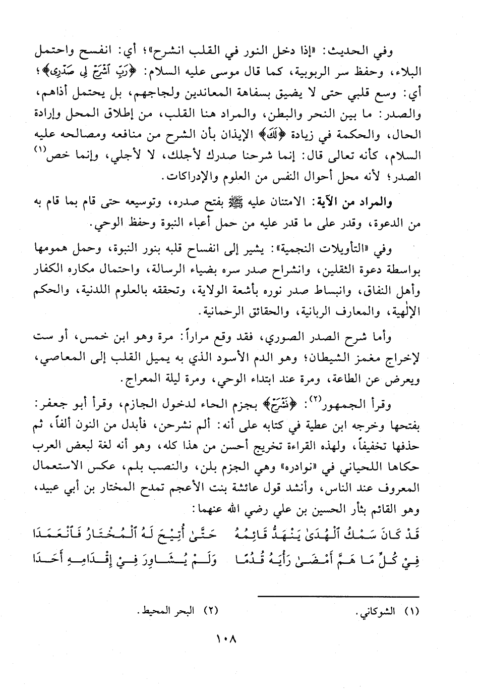 وفي الحديث: "إذا دخل النور في القلب انشرح"؛ أي: انفسح واحتمل البلاء، وحفظ سر الربوبية، كما قال موسى عليه السلام: {قَالَ رَبِّ اشْرَحْ لِي صَدْرِي}؛ أي: وسع قلبي حتى لا يضيق بسفاهة المعاندين ولجاجهم، بل يحتمل أذاهم، والصدر: ما بين النحر والبطن، والمراد هنا القلب، من إطلاق المحل وإرادة الحال، والحكمة في زيادة {لَكَ} الإيذان بأن الشرح من منافعه ومصالحه عليه السلام، كأنه تعالى قال: إنما شرحنا صدرك لأجلك، لا لأجلي، وإنما خص (¬1) الصدر؛ لأنه محل أحوال النفس من العلوم والإدراكات.
