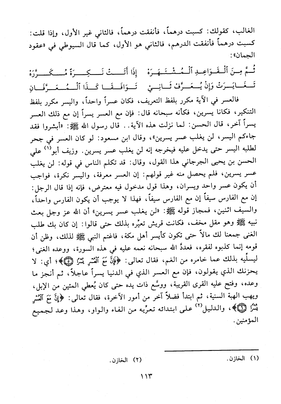 فالعسر في الآية مكرر بلفظ التعريف، فكان عسرًا واحدًا، واليسر مكرر بلفظ التنكير، فكانا يسرين، فكأنه سبحانه قال: فإن مع العسر يسرًا إن مع ذلك العسر يسرًا آخر، قال الحسن: لما نزلت هذه الآية .. قال رسول الله - صلى الله عليه وسلم -: "أبشروا فقد جاءكم اليسر، لن يغلب عسر يسرين"، وقال ابن مسعود: لو كان العسر في جحر لطلبه اليسر حتى يدخل عليه فيخرجه إنه لن يغلب عسر يسرين. وزيف أبو (¬1) علي الحسن بن يحيى الجرجاني هذا القول، وقال: قد تكلم الناس في قوله: لن يغلب عسر يسرين، فلم يحصل منه غير قولهم: إن العسر معرفة، واليسر نكرة، فواجب أن يكون عسر واحد ويسران، وهذا قول مدخول فيه معترض، فإنه إذا قال الرجل: إن مع الفارس سيفًا إن مع الفارس سيفًا، فهذا لا يوجب أن يكون الفارس واحدًا، والسيف اثنين، فمجاز قوله - صلى الله عليه وسلم -: "لن يغلب عسر يسرين" أن الله عز وجل بعث نبيه - صلى الله عليه وسلم - وهو مقل مخف، فكانت قريش تعيَّره بذلك حتى قالوا: إن كان بك طلب الغنى جمعنا لك مالًا حتى تكون كأيسر أهل مكة، فاغتم النبي - صلى الله عليه وسلم - لذلك، وظن أن قومه إنما كذبوه لفقره، فعددَّ الله سبحانه نعمه عليه في هذه السورة، ووعده الغنى؛ ليسلَّيه بذلك عما خامره من الغم، فقال تعالى: {فَإِنَّ مَعَ الْعُسْرِ يُسْرًا (5)}؛ أي: لا يحزنك الذي يقولون، فإن مع العسر الذي في الدنيا يسرًا عاجلًا، ثم أنجز ما وعده، وفتح عليه القرى القريبة، ووسَّع ذات يده حتى كان يُعطي المئين من الإبل، ويهب الهبة السنية، ثم ابتدأ فضلًا آخر من أمور الآخرة، فقال تعالى: {إِنَّ مَعَ الْعُسْرِ يُسْرًا (6)}، والدليل (¬2) على ابتدائه تعنيه من الفاء والواو، وهذا وعد لجميع المؤمنين.