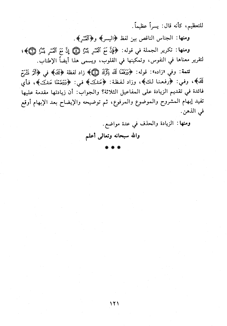 تتمة: وفي "زاده": قوله: {وَرَفَعْنَا لَكَ ذِكْرَكَ (4)} زاد لفظة {لَكَ} في {أَلَمْ نَشْرَحْ لَكَ}، وفي: {رفعنا لك}، وزاد لفظة: {عَنْكَ} في: {وَوَضَعْنَا عَنْكَ}، فأي فائدة في تقديم الزيادة على المفاعيل الثلاثة؟ والجواب: أن زيادتها مقدمة عليها تفيد إبهام المشروح والموضوع والمرفوع، ثم توضيحه والإيضاح بعد الإبهام أوقع في الذهن.