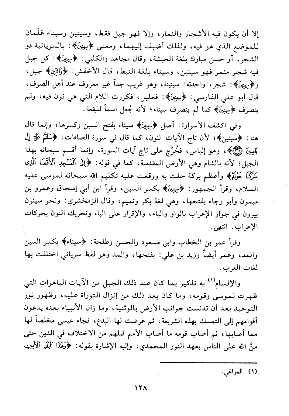وفي "كشف الأسرار": أصل {سِينِينَ} سيناء بفتح السين وكسرها، وإنما قال هنا: {سينين}؛ لأن تاج الآيات النون، كما قال في سورة الصافات: {سَلَامٌ عَلَى إِلْ يَاسِينَ (130)}، وهو إلياس، فخُرّج على تاج آيات السورة، وإنما أقسم سبحانه بهذا الجبل؛ لأنه بالشام وهي الأرض المقدسة، كما في قوله: {إِلَى الْمَسْجِدِ الْأَقْصَى الَّذِي بَارَكْنَا حَوْلَهُ} وأعظم بركة حلت به ووقعت عليه تكليم الله سبحانه لموسى عليه السلام، وقرأ الجمهور: {سِينِينَ} بكسر السين، وقرأ ابن أبي إسحاق وعمرو بن ميمون وأبو رجاء بفتحها، وهي لغة بكر وتميم، وقال الزمخشري: ونحو سينون بيرون في جواز الإعراب بالواو والياء، والإقرار على الياء وتحريك النون بحركات الإعراب. انتهى.