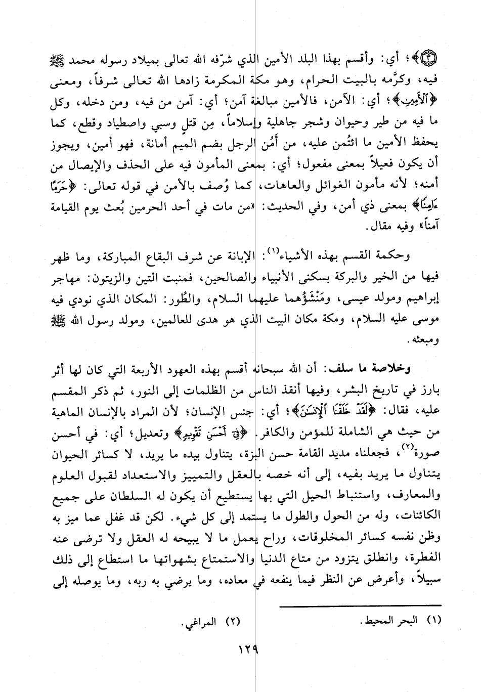 وحكمة القسم بهذه الأشياء (¬1): الإبانة عن شرف البقاع المباركة، وما ظهر فيها من الخير والبركة بسكنى الأنبياء والصالحين، فمنبت التين والزيتون: مهاجر إبراهيم ومولد عيسى، ومَنْشَؤُهما عليهما السلام، والطُور: المكان الذي نودي فيه موسى عليه السلام، ومكة مكان البيت الذي هو هدى للعالمين، ومولد رسول الله - صلى الله عليه وسلم - ومبعثه.