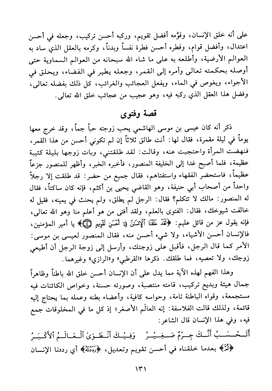 ذكر أنه كان عيسى بن موسى الهاشمي يحب زوجته حبًا جمًا، وقد خرج معها يومًا في ليلة مقمرة، فقال لها: أنت طالق ثلاثًا إن لم تكوني أحسن من هذا القمر، فنهضت المرأة واحتجبت عنه، وقالت: لقد طلقتني، وبات زوجها بليلة كئيبة عظيمة، فلما أصبح غدا إلى الخليفة المنصور، فأخبره الخبر، وأظهر للمنصور جزعًا عظيمًا، فاستحضر الفقهاء واستفتاهم، فقال جميع من حضر: قد طلقت إلا رجلًا واحدًا من أصحاب أبي حنيفة، وهو القاضي يحيى بن أكثم، فإنه كان ساكتًا، فقال له المنصور: مالك لا تتكلم؟ فقال: الرجل لم يطلق، ولم يحنث في يمينه، فقيل له خالفت شيوخك، فقال: الفتوى بالعلم، ولقد أفتى من هو أعلم منا وهو الله تعالى، فإنه يقول عز من قائل عليم: {لَقَدْ خَلَقْنَا الْإِنْسَانَ فِي أَحْسَنِ تَقْوِيمٍ (4)} يا أمير المؤمنين، فالإنسان أحسن الأشياء، ولا شيء أحسن منه، فقال المنصور لعيسى بن موسى: الأمر كما قال الرجل، فأقبل على زوجتك، وأرسل إلى زوجة الرجل أن أطيعي زوجك، ولا تعصيه، فما طلقك. ذكرها "القرطبي" و"الرازي" وغيرهما.