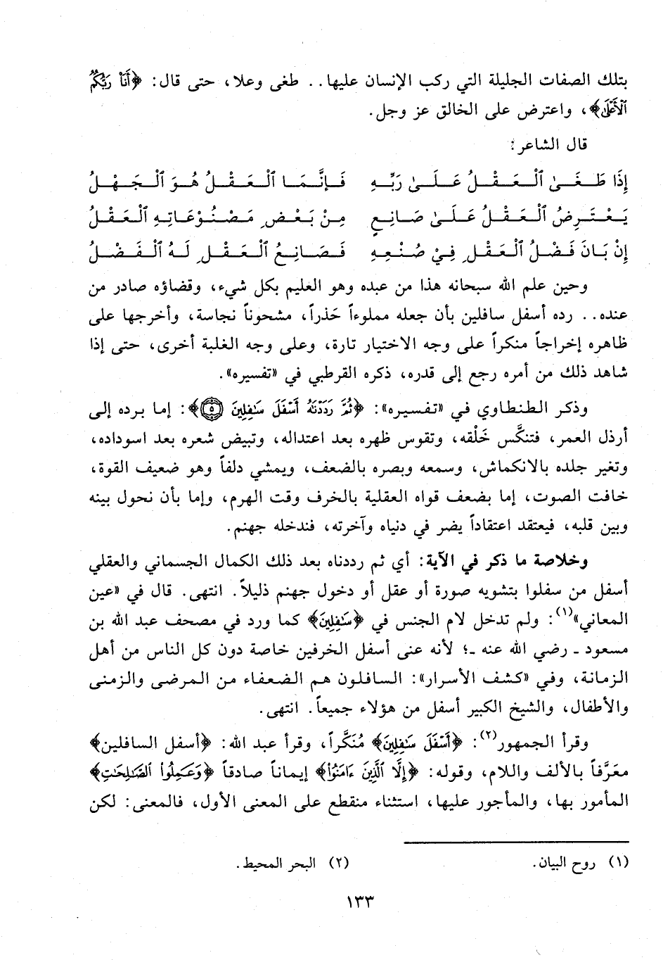 وذكر الطنطاوي في "تفسيره": {ثُمَّ رَدَدْنَاهُ أَسْفَلَ سَافِلِينَ (5)}: إما برده إلى أرذل العمر، فتنكَّس خَلْقه، وتقوس ظهره بعد اعتداله، وتبيض شعره بعد اسوداده، وتغير جلده بالانكماش، وسمعه وبصره بالضعف، ويمشي دلفًا وهو ضعيف القوة، خافت الصوت، إما بضعف قواه العقلية بالخرف وقت الهرم، وإما بأن نحول بينه وبين قلبه، فيعتقد اعتقادًا يضر في دنياه وآخرته، فندخله جهنم.