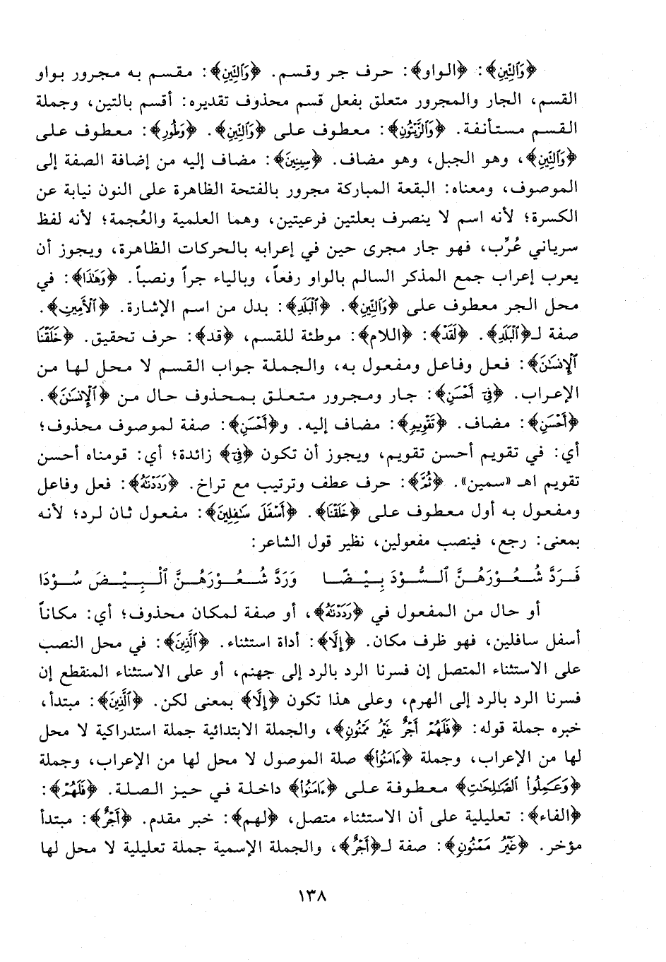 {وَالتِّينِ}: {الواو}: حرف جر وقسم. {وَالتِّينِ}: مقسم به مجرور بواو القسم، الجار والمجرور متعلق بفعل قسم محذوف تقديره: أقسم بالتين، وجملة القسم مستأنفة. {وَالزَّيْتُونِ}: معطوف على {وَالتِّينِ}. {وَطُورِ}: معطوف على {وَالتِّينِ}، وهو الجبل، وهو مضاف. {سِينِينَ}: مضاف إليه من إضافة الصفة إلى الموصوف، ومعناه: البقعة المباركة مجرور بالفتحة الظاهرة على النون نيابة عن الكسرة؛ لأنه اسم لا ينصرف بعلتين فرعيتين، وهما العلمية والعُجمة؛ لأنه لفظ سرياني عُرِّب، فهو جار مجرى حين في إعرابه بالحركات الظاهرة، ويجوز أن يعرب إعراب جمع المذكر السالم بالواو رفعًا، وبالياء جرًا ونصبًا. {وَهَذَا}: في محل الجر معطوف على {وَالتِّينِ}. {الْبَلَدِ}: بدل من اسم الإشارة. {الْأَمِينِ}. صفة لـ {الْبَلَدِ}. {لَقَدْ}: {اللام}: موطئة للقسم، {قد}: حرف تحقيق. {خَلَقْنَا الْإِنْسَانَ}: فعل وفاعل ومفعول به، والجملة جواب القسم لا محل لها من الإعراب. {فِي أَحْسَن}: جار ومجرور متعلق بمحذوف حال من {الْإِنْسَانَ}. {أَحْسَنِ}: مضاف. {تَقْوِيمٍ}: مضاف إليه. و {أَحْسَنِ}: صفة لموصوف محذوف؛ أي: في تقويم أحسن تقويم، ويجوز أن تكون {فِي} زائدة؛ أي: قومناه أحسن تقويم اهـ "سمين". {ثُمَّ}: حرف عطف وترتيب مع تراخ. {رَدَدْنَاهُ}: فعل وفاعل ومفعول به أول معطوف على {خَلَقْنَا}. {أَسْفَلَ سَافِلِينَ}: مفعول ثان لرد؛ لأنه بمعنى: رجع، فينصب مفعولين، نظير قول الشاعر: