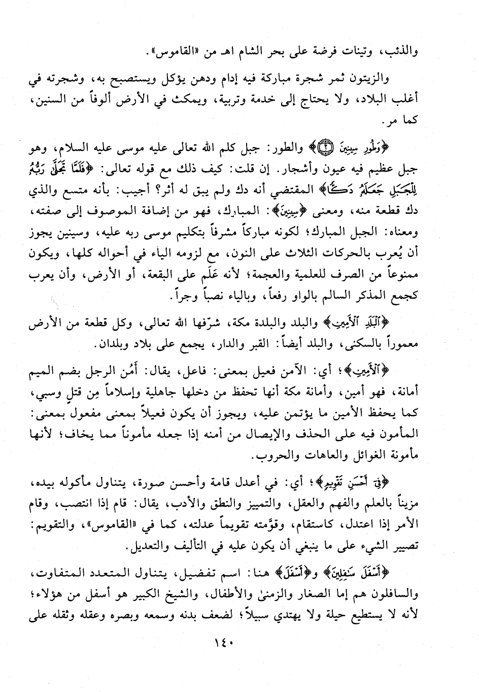{وَطُورِ سِينِينَ (2)} والطور: جبل كلم الله تعالى عليه موسى عليه السلام، وهو جبل عظيم فيه عيون وأشجار. إن قلت: كيف ذلك مع قوله تعالى: {فَلَمَّا تَجَلَّى رَبُّهُ لِلْجَبَلِ جَعَلَهُ دَكًّا} المقتضي أنه دك ولم يبق له أثر؛ أجيب: بأنه متسع والذي دك قطعة منه، ومعنى {سِينِينَ}: المبارك، فهو من إضافة الموصوف إلى صفته، ومعناه: الجبل المبارك؛ لكونه مباركًا مشرفًا بتكليم موسى ربه عليه، وسينين يجوز أن يُعرب بالحركات الثلاث على النون، مع لزومه الياء في أحواله كلها، ويكون ممنوعًا من الصرف للعلمية والعجمة؛ لأنه عَلَم على البقعة، أو الأرض، وأن يعرب كجمع المذكر السالم بالواو رفعًا، وبالياء نصبًا وجرًا.