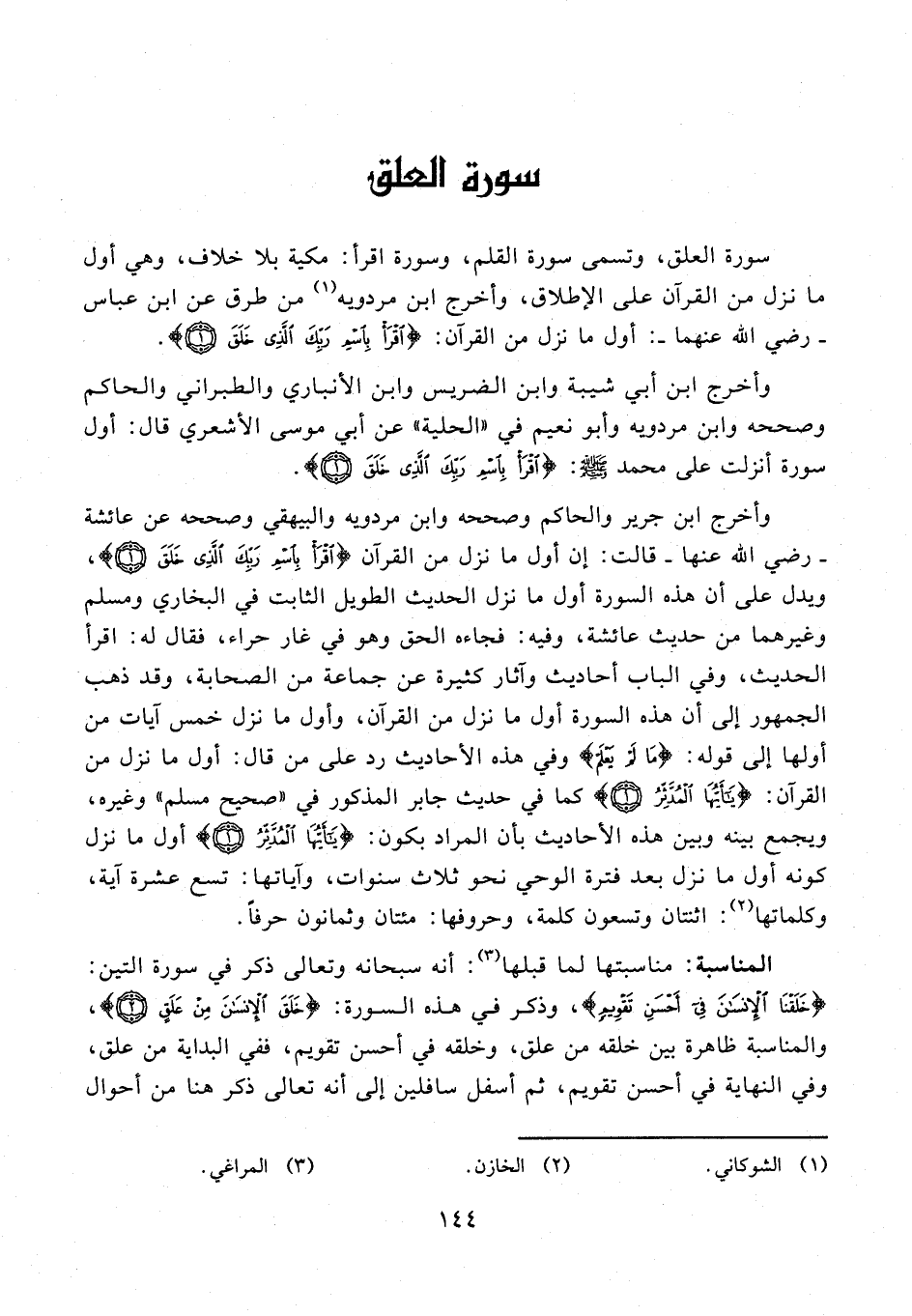 المناسبة: مناسبتها لما قبلها (¬3): أنه سبحانه وتعالى ذكر في سورة التين: {خَلَقْنَا الْإِنْسَانَ فِي أَحْسَنِ تَقْوِيمٍ}، وذكر في هذه السورة: {خَلَقَ الْإِنْسَانَ مِنْ عَلَقٍ (2)}، والمناسبة ظاهرة بين خلقه من علق، وخلقه في أحسن تقويم، ففي البداية من علق، وفي النهاية في أحسن تقويم، ثم أسفل سافلين إلى أنه تعالى ذكر هنا من أحوال