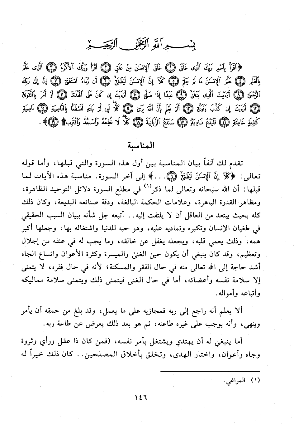 {اقْرَأْ بِاسْمِ رَبِّكَ الَّذِي خَلَقَ (1) خَلَقَ الْإِنْسَانَ مِنْ عَلَقٍ (2) اقْرَأْ وَرَبُّكَ الْأَكْرَمُ (3) الَّذِي عَلَّمَ بِالْقَلَمِ (4) عَلَّمَ الْإِنْسَانَ مَا لَمْ يَعْلَمْ (5) كَلَّا إِنَّ الْإِنْسَانَ لَيَطْغَى (6) أَنْ رَآهُ اسْتَغْنَى (7) إِنَّ إِلَى رَبِّكَ الرُّجْعَى (8) أَرَأَيْتَ الَّذِي يَنْهَى (9) عَبْدًا إِذَا صَلَّى (10) أَرَأَيْتَ إِنْ كَانَ عَلَى الْهُدَى (11) أَوْ أَمَرَ بِالتَّقْوَى (12) أَرَأَيْتَ إِنْ كَذَّبَ وَتَوَلَّى (13) أَلَمْ يَعْلَمْ بِأَنَّ اللَّهَ يَرَى (14) كَلَّا لَئِنْ لَمْ يَنْتَهِ لَنَسْفَعًا بِالنَّاصِيَةِ (15) نَاصِيَةٍ كَاذِبَةٍ خَاطِئَةٍ (16) فَلْيَدْعُ نَادِيَهُ (17) سَنَدْعُ الزَّبَانِيَةَ (18) كَلَّا لَا تُطِعْهُ وَاسْجُدْ وَاقْتَرِبْ (19)}.