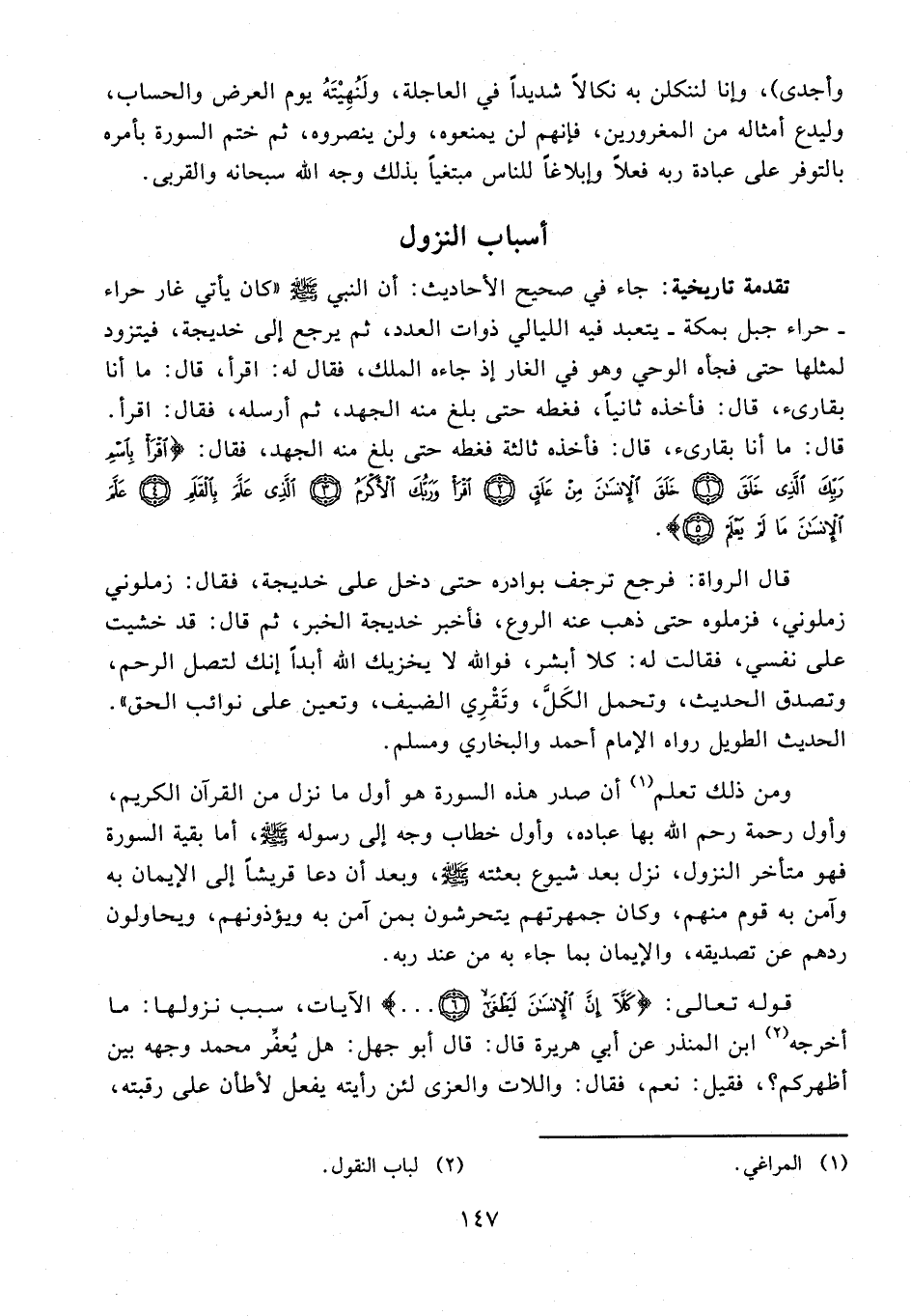 تقدمة تاريخية: جاء في صحيح الأحاديث: أن النبي - صلى الله عليه وسلم - "كان يأتي غار حراء - حراء جبل بمكة - يتعبد فيه الليالي ذوات العدد، ثم يرجع إلى خديجة، فيتزود لمثلها حتى فجأه الوحي وهو في الغار إذ جاءه الملك، فقال له: اقرأ، قال: ما أنا بقارىء، قال: فأخذه ثانيًا، فغطه حتى بلغ منه الجهد، ثم أرسله، فقال: اقرأ. قال: ما أنا بقارىء، قال: فأخذه ثالثة فغطه حتى بلغ منه الجهد، فقال: {اقْرَأْ بِاسْمِ رَبِّكَ الَّذِي خَلَقَ (1) خَلَقَ الْإِنْسَانَ مِنْ عَلَقٍ (2) اقْرَأْ وَرَبُّكَ الْأَكْرَمُ (3) الَّذِي عَلَّمَ بِالْقَلَمِ (4) عَلَّمَ الْإِنْسَانَ مَا لَمْ يَعْلَمْ (5)}.