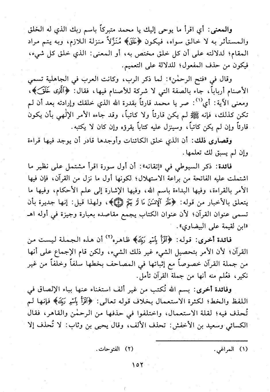فائدة أخرى: قوله: {اقْرَأْ بِاسْمِ رَبِّكَ} ظاهره (¬2) أن هذه الجملة ليست من القرآن؛ لأن الأمر بتحصيل الشيء غير ذلك الشيء، ولكن قام الإجماع على أنها من جملة القرآن خصوصًا مع إثباتها في المصاحف بخطها سلفًا وخلفًا من غير نكير، فعُلم منه أنها من جملة القرآن تأمل.