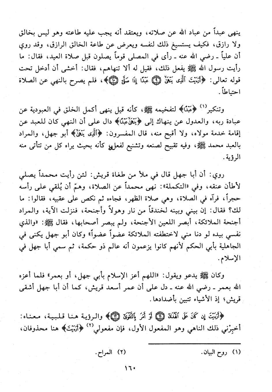 ينهى عبدًا من عباد الله عن صلاته، ويعتقد أنه يجب عليه طاعته وهو ليس بخالق ولا رازق، فكيف يستسيغ ذلك لنفسه ويعرض عن طاعة الخالق الرازق، وقد روي أن عليًا - رضي الله عنه - رأى في المصلى قومًا يصلون قبل صلاة العيد، فقال: ما رأيت رسول الله - صلى الله عليه وسلم - يفعل ذلك، فقيل له ألا تنهاهم، فقال: أخشى أن أدخل تحت قوله تعالى: {أَرَأَيْتَ الَّذِي يَنْهَى (9) عَبْدًا إِذَا صَلَّى (10)}، فلم يصرح بالنهي عن الصلاة احتياطًا.