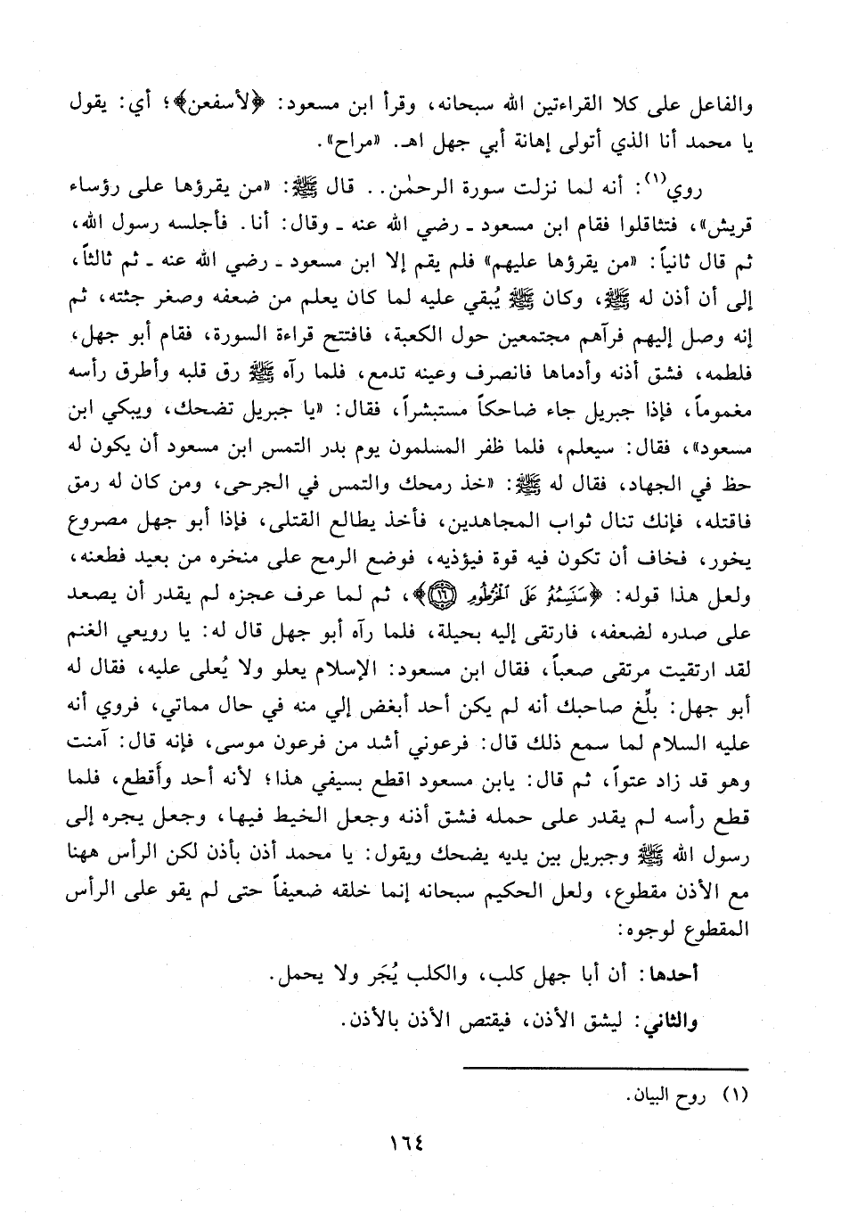 روي (¬1): أنه لما نزلت سورة الرحمن .. قال - صلى الله عليه وسلم -: "من يقرؤها على رؤساء قريش"، فتثاقلوا فقام ابن مسعود - رضي الله عنه - وقال: أنا. فأجلسه رسول الله، ثم قال ثانيًا: "من يقرؤها عليهم" فلم يقم إلا ابن مسعود - رضي الله عنه - ثم ثالثًا، إلى أن أذن له - صلى الله عليه وسلم -، وكان - صلى الله عليه وسلم - يُبقي عليه لما كان يعلم من ضعفه وصغر جثته، ثم إنه وصل إليهم فرآهم مجتمعين حول الكعبة، فافتتح قراءة السورة، فقام أبو جهل، فلطمه، فشق أذنه وأدماها فانصرف وعينه تدمع، فلما رآه - صلى الله عليه وسلم - رق قلبه وأطرق رأسه مغمومًا، فإذا جبريل جاء ضاحكًا مستبشرًا، فقال: "يا جبريل تضحك، ويبكي ابن مسعود"، فقال: سيعلم، فلما ظفر المسلمون يوم بدر التمس ابن مسعود أن يكون له حظ في الجهاد، فقال له - صلى الله عليه وسلم -: "خذ رمحك والتمس في الجرحى، ومن كان له رمق فاقتله، فإنك تنال ثواب المجاهدين، فأخذ يطالع القتلى، فإذا أبو جهل مصروع يخور، فخاف أن تكون فيه قوة فيؤديه، فوضع الرمح على منخره من بعيد فطعنه، ولعل هذا قوله: {سَنَسِمُهُ عَلَى الْخُرْطُومِ (16)}، ثم لما عرف عجزه لم يقدر أن يصعد على صدره لضعفه، فارتقى إليه بحيلة، فلما رآه أبو جهل قال له: يا رويعي الغنم لقد ارتقيت مرتقى صعبًا، فقال ابن مسعود: الإِسلام يعلو ولا يُعلى عليه، فقال له أبو جهل: بلِّغ صاحبك أنه لم يكن أحد أبغض إلى منه في حال مماتي، فروي أنه عليه السلام لما سمع ذلك قال: فرعوني أشد من فرعون موسى، فإنه قال: آمنت وهو قد زاد عتوًا، ثم قال: يابن مسعود اقطع بسيفي هذا؛ لأنه أحد وأَقطع، فلما قطع رأسه لم يقدر على حمله فشق أذنه وجعل الخيط فيها، وجعل يجره إلى رسول الله - صلى الله عليه وسلم - وجبريل بين يديه يضحك ويقول: يا محمد أذن بأذن لكن الرأس هاهنا مع الأذن مقطوع، ولعل الحكيم سبحانه إنما خلقه ضعيفًا حتى لم يقول على الرأس المقطوع لوجوه: