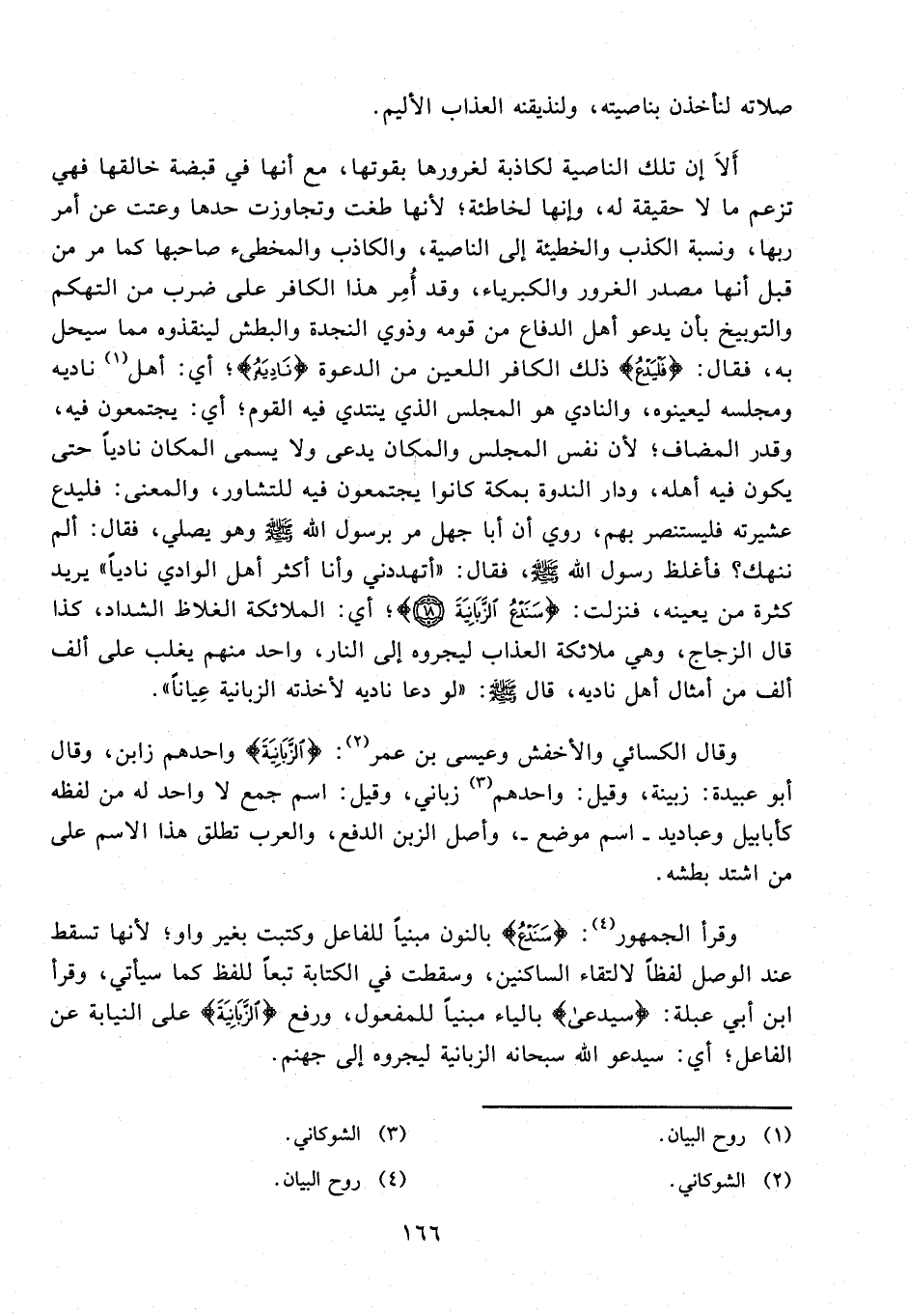 18 - روي أن أبا جهل مر برسول الله - صلى الله عليه وسلم - وهو يصلي، فقال: ألم ننهك؟ فأغلظ رسول الله - صلى الله عليه وسلم -، فقال: "أتهددني وأنا أكثر أهل الوادي ناديًا" يريد كثرة من يعينه، فنزلت: {سَنَدْعُ الزَّبَانِيَةَ}؛ أي: الملائكة الغلاظ الشداد، كذا قال الزجاج، وهي ملائكة العذاب ليجروه إلى النار، واحد منهم يغلب على ألف ألف من أمثال أهل ناديه، قال - صلى الله عليه وسلم -: "لو دعا ناديه لأخذته الزبانية عِيانًا".