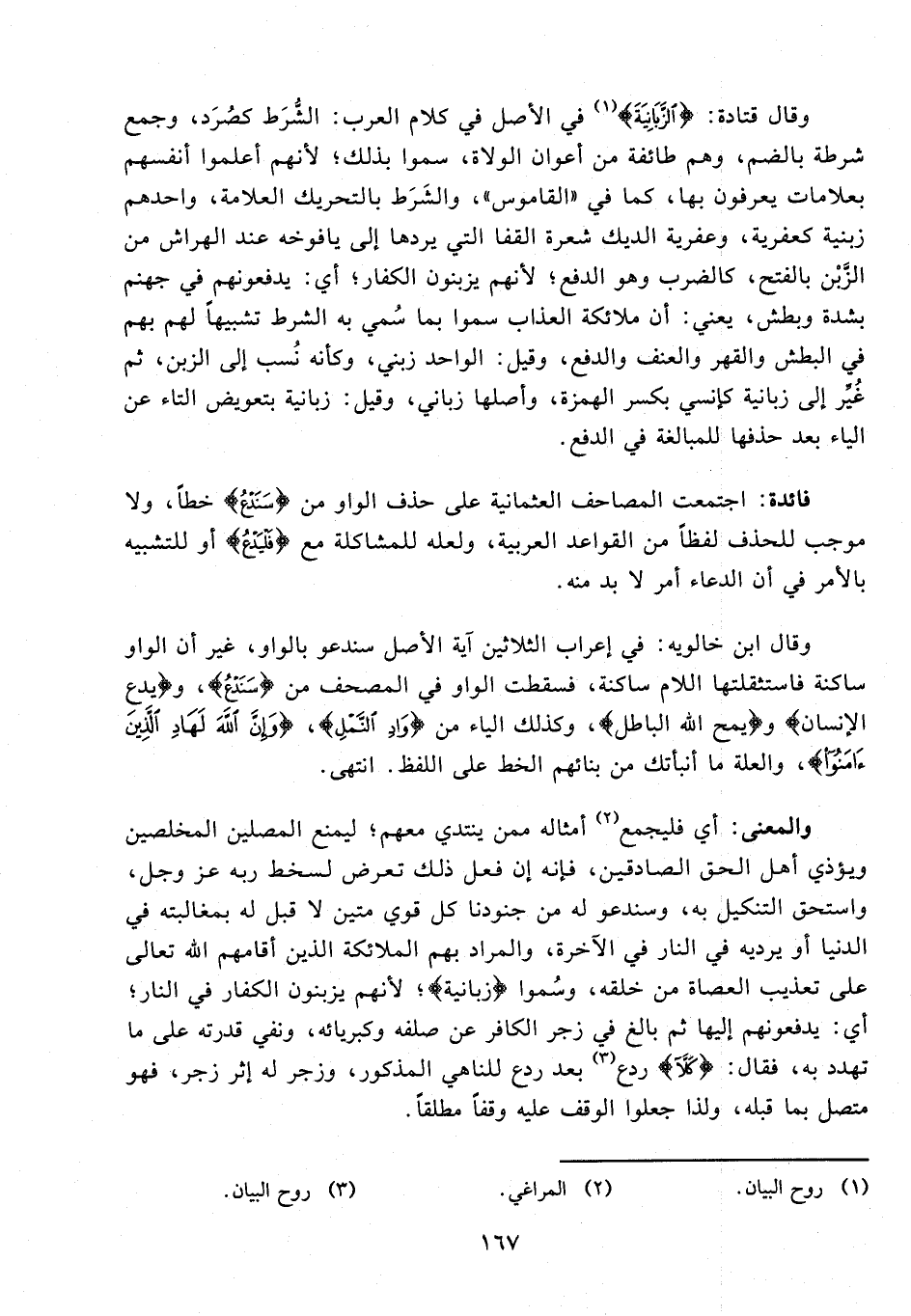 وقال قتادة: {الزَّبَانِيَةَ} (¬1) في الأصل في كلام العرب: الشُرَط كصُرَد، وجمع شرطة بالضم، وهم طائفة من أعوان الولاة، سموا بذلك؛ لأنهم أعلموا أنفسهم بعلامات يعرفون بها، كما في "القاموس"، والشَرَط بالتحريك العلامة، واحدهم زبنية كعفرية، وعفرية الديك شعرة القفا التي يردها إلى يافوخه عند الهراش من الزَّبْن بالفتح، كالضرب وهو الدفع؛ لأنهم يزبنون الكفار؛ أي: يدفعونهم في جهنم بشدة وبطش، يعني: أن ملائكة العذاب سموا بما سُمي به الشرط تشبيهًا لهم بهم في البطش والقهر والعنف والدفع، وقيل: الواحد زبني، وكأنه نُسب إلى الزبن، ثم غُيِّر إلى زبانية كإنسي بكسر الهمزة، وأصلها زباني، وقيل: زبانية بتعويض التاء عن الياء بعد حذفها للمبالغة في الدفع.