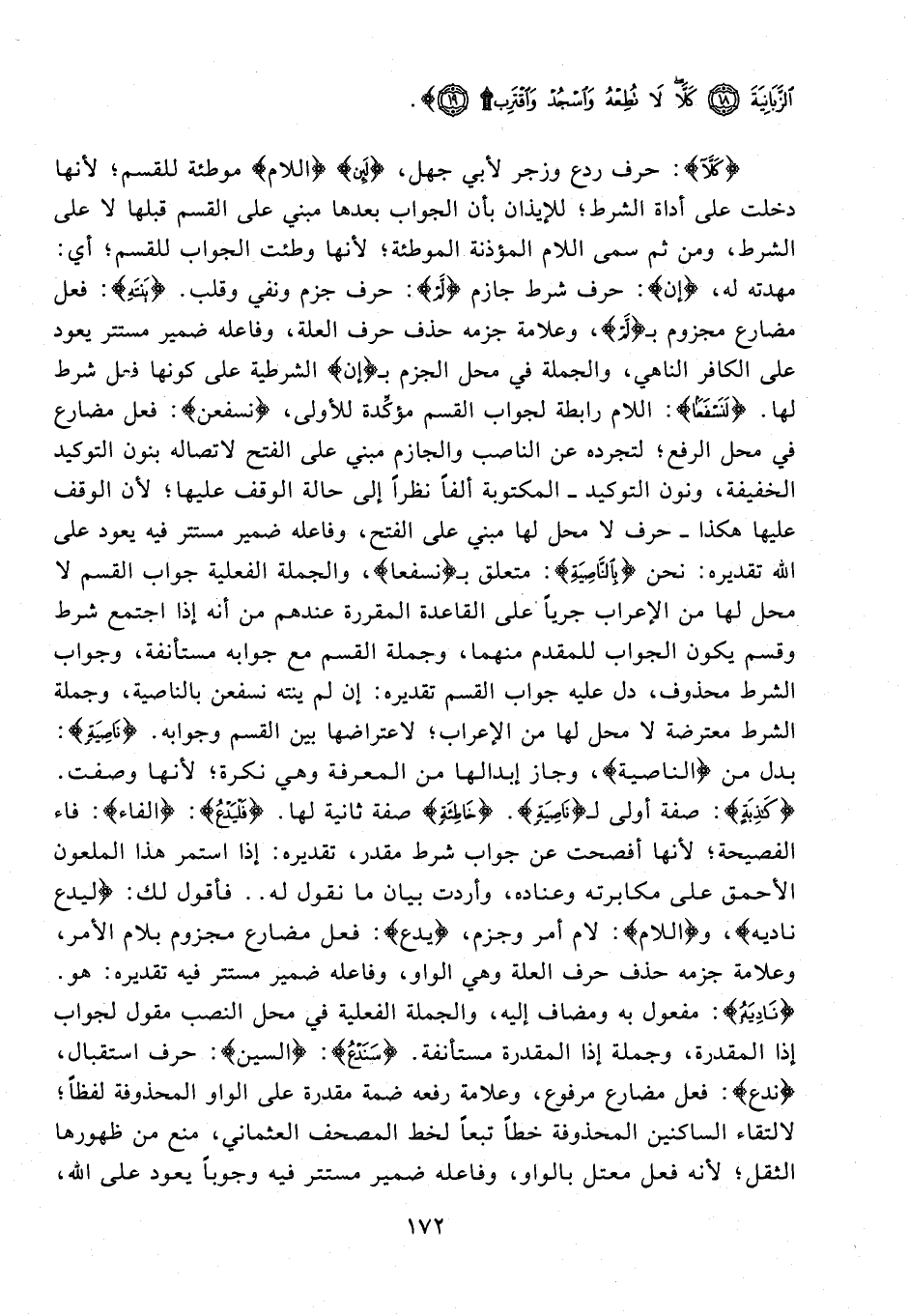 {كَلَّا}: حرف ردع وزجر لأبي جهل، {لَئِنْ} {اللام} موطئة للقسم؛ لأنها دخلت على أداة الشرط؛ للإيذان بأن الجواب بعدها مبني على القسم قبلها لا على الشرط، ومن ثم سمى اللام المؤذنة الموطئة؛ لأنها وطئت الجواب للقسم؛ أي: مهدته له، {إن}: حرف شرط جازم {لَمْ}: حرف جزم ونفي وقلب. {يَنْتَهِ}: فعل مضارع مجزوم بـ {لَمْ}، وعلامة جزمه حذف حرف العلة، وفاعله ضمير مستتر يعود على الكافر الناهي، والجملة في محل الجزم بـ {إن} الشرطية على كونها فعل شرط لها. {لَنَسْفَعًا}: اللام رابطة لجواب القسم مؤكِّدة للأولى، {نسفعن}: فعل مضارع في محل الرفع؛ لتجرده عن الناصب والجازم مبني على الفتح لاتصاله بنون التوكيد الخفيفة، ونون التوكيد - المكتوبة ألفًا نظرًا إلى حالة الوقف عليها؛ لأن الوقف عليها هكذا - حرف لا محل لها مبني على الفتح، وفاعله ضمير مستتر فيه يعود على الله تقديره: نحن {بِالنَّاصِيَةِ}: متعلق بـ {نسفعا}، والجملة الفعلية جواب القسم لا محل لها من الإعراب جريًا على القاعدة المقررة عندهم من أنه إذا اجتمع شرط وقسم يكون الجواب للمقدم منهما، وجملة القسم مع جوابه مستأنفة، وجواب الشرط محذوف، دل عليه جواب القسم تقديره: إن لم ينته نسفعن بالناصية، وجملة الشرط معترضة لا محل لها من الإعراب؛ لاعتراضها بين القسم وجوابه. {نَاصِيَةٍ}: بدل من {الناصية}، وجاز إبدالها من المعرفة وهي نكرة؛ لأنها وصفت. {كَاذِبَةٍ}: صفة أولى لـ {نَاصِيَةٍ}. {خَاطِئَةٍ} صفة ثانية لها. {فَلْيَدْعُ}: {الفاء}: فاء الفصيحة؛ لأنها أفصحت عن جواب شرط مقدر، تقديره: إذا استمر هذا الملعون الأحمق على مكابرته وعناده، وأردت بيان ما نقول له .. فأقول لك: {ليدع ناديه}، و {اللام}: لام أمر وجزم، {يدع}: فعل مضارع مجزوم بلام الأمر، وعلامة جزمه حذف حرف العلة وهي الواو، وفاعله ضمير مستتر فيه تقديره: هو. {نَادِيَهُ}: مفعول به ومضاف إليه، والجملة الفعلية في محل النصب مقول لجواب إذا المقدرة، وجملة إذا المقدرة مستأنفة. {سَنَدْعُ}: {السين}: حرف استقبال، {ندع}: فعل مضارع مرفوع، وعلامة رفعه ضمة مقدرة على الواو المحذوفة لفظًا؛ لالتقاء الساكنين المحذوفة خطًا تبعًا لخط المصحف العثماني، منع من ظهورها الثقل؛ لأنه فعل معتل بالواو، وفاعله ضمير مستتر فيه وجوبًا يعود على الله،